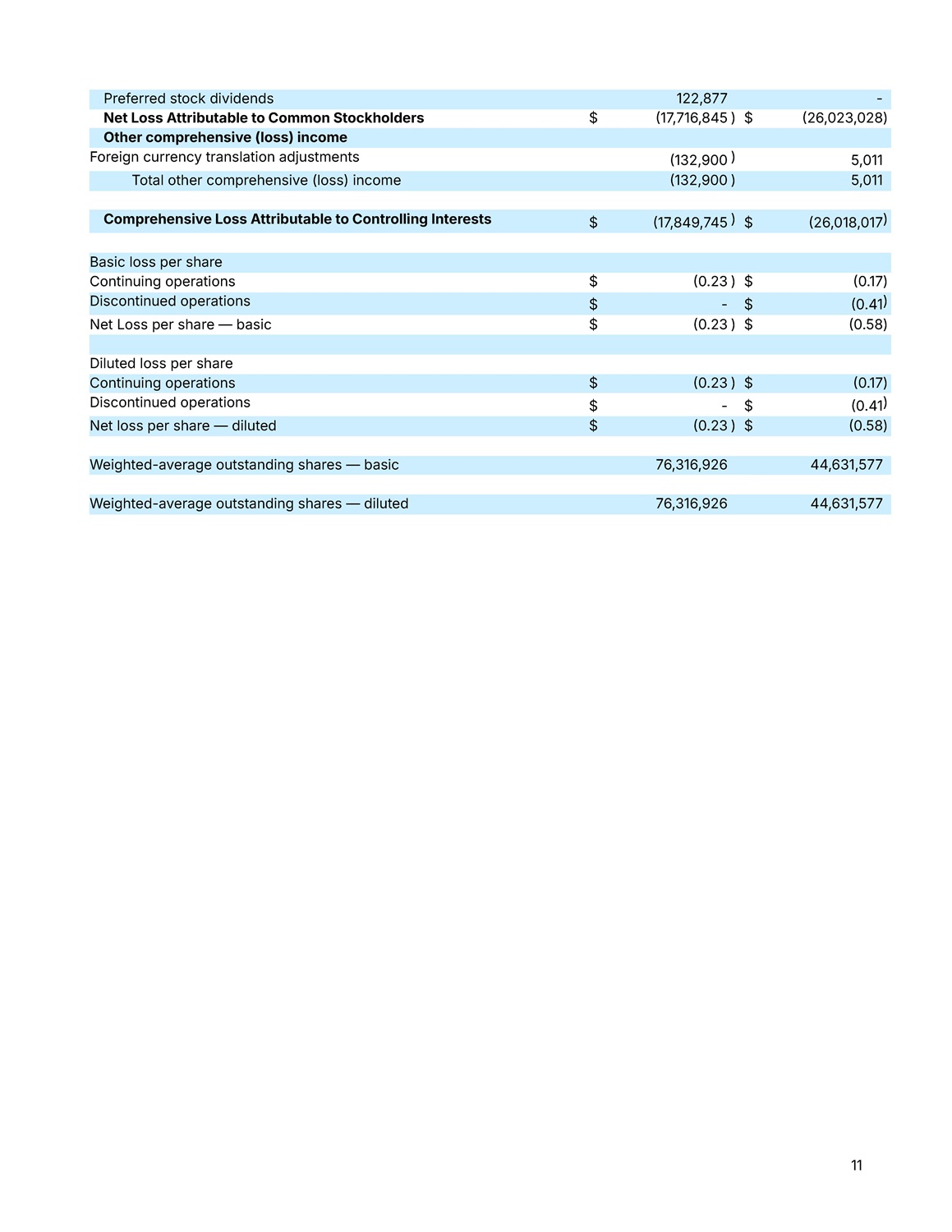 11 - 122,877 Preferred stock dividends )  26,023,028 $ )  17,716,845 $ Net Loss Attributable to Common Stockholders Other comprehensive (loss) income 5,011 )  132,900 Foreign currency translation adjustments 5,011 )  132,900 Total other comprehensive (loss) income )  26,018,017 $ )  17,849,745 $ Comprehensive Loss Attributable to Controlling Interests Basic loss per share )  0.17 $ )  0.23 $ Continuing operations )  0.41 $ - $ Discontinued operations )  0.58 $ )  0.23 $ Net Loss per share — basic Diluted loss per share )  0.17 $ )  0.23 $ Continuing operations )  0.41 $ - $ Discontinued operations )  0.58 $ )  0.23 $ Net loss per share — diluted 44,631,577 76,316,926 Weighted - average outstanding shares — basic 44,631,577 76,316,926 Weighted - average outstanding shares — diluted
