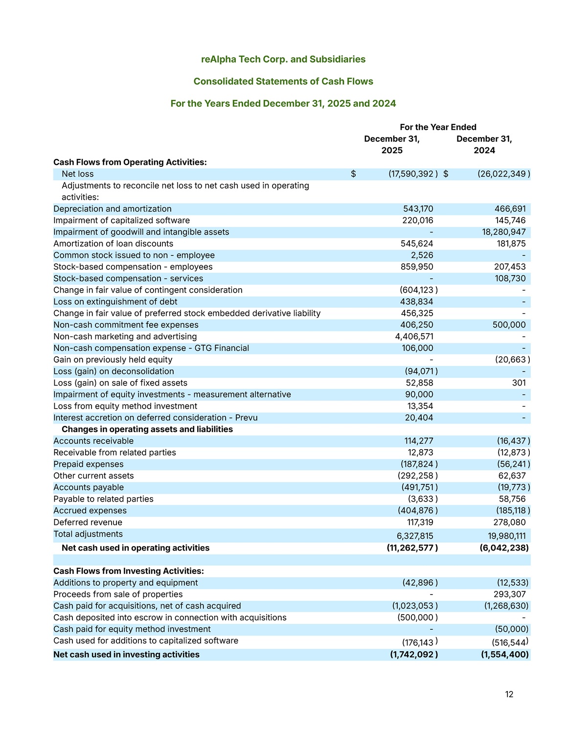 12 For the Year Ended December 31, 2024 December 31, 2025 Cash Flows from Operating Activities: )  26,022,349 $ )  17,590,392 $ Net loss Adjustments to reconcile net loss to net cash used in operating activities: 466,691 543,170 Depreciation and amortization 145,746 220,016 Impairment of capitalized software 18,280,947 - Impairment of goodwill and intangible assets 181,875 545,624 Amortization of loan discounts - 2,526 Common stock issued to non - employee 207,453 859,950 Stock - based compensation - employees 108,730 - Stock - based compensation - services - )  604,123 Change in fair value of contingent consideration - 438,834 Loss on extinguishment of debt - 456,325 Change in fair value of preferred stock embedded derivative liability 500,000 406,250 Non - cash commitment fee expenses - 4,406,571 Non - cash marketing and advertising - 106,000 Non - cash compensation expense - GTG Financial )  20,663 - Gain on previously held equity - )  94,071 Loss (gain) on deconsolidation 301 52,858 Loss (gain) on sale of fixed assets - 90,000 Impairment of equity investments - measurement alternative - 13,354 Loss from equity method investment - 20,404 Interest accretion on deferred consideration - Prevu Changes in operating assets and liabilities )  16,437 114,277 Accounts receivable )  12,873 12,873 Receivable from related parties )  56,241 )  187,824 Prepaid expenses 62,637 )  292,258 Other current assets )  19,773 )  491,751 Accounts payable 58,756 )  3,633 Payable to related parties )  185,118 )  404,876 Accrued expenses 278,080 117,319 Deferred revenue 19,980,111 6,327,815 Total adjustments )  6,042,238 )  11,262,577 Net cash used in operating activities Cash Flows from Investing Activities: )  12,533 )  42,896 Additions to property and equipment 293,307 - Proceeds from sale of properties )  1,268,630 )  1,023,053 Cash paid for acquisitions, net of cash acquired - )  500,000 Cash deposited into escrow in connection with acquisitions )  50,000 - Cash paid for equity method investment )  516,544 )  176,143 Cash used for additions to capitalized software )  1,554,400 )  1,742,092 Net cash used in investing activities reAlpha Tech Corp. and Subsidiaries Consolidated Statements of Cash Flows For the Years Ended December 31, 2025 and 2024