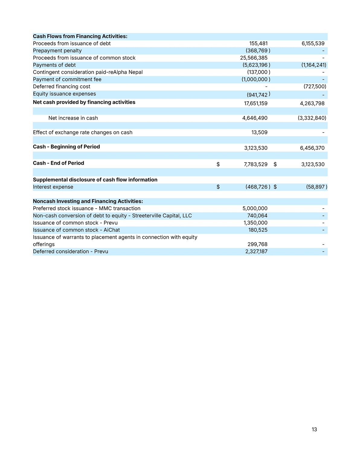 13 Cash Flows from Financing Activities: 6,155,539 155,481 Proceeds from issuance of debt - )  368,769 Prepayment penalty - 25,566,385 Proceeds from issuance of common stock )  1,164,241 )  5,623,196 Payments of debt - )  137,000 Contingent consideration paid - reAlpha Nepal - )  1,000,000 Payment of commitment fee )  727,500 - Deferred financing cost - )  941,742 Equity issuance expenses 4,263,798 17,651,159 Net cash provided by financing activities )  3,332,840 4,646,490 Net increase in cash - 13,509 Effect of exchange rate changes on cash 6,456,370 3,123,530 Cash - Beginning of Period 3,123,530 $ 7,783,529 $ Cash - End of Period Supplemental disclosure of cash flow information )  58,897 $ )  468,726 $ Interest expense Noncash Investing and Financing Activities: - 5,000,000 Preferred stock issuance - MMC transaction - 740,064 Non - cash conversion of debt to equity - Streeterville Capital, LLC - 1,350,000 Issuance of common stock - Prevu - 180,525 Issuance of common stock - AiChat - 299,768 Issuance of warrants to placement agents in connection with equity offerings - 2,327,187 Deferred consideration - Prevu