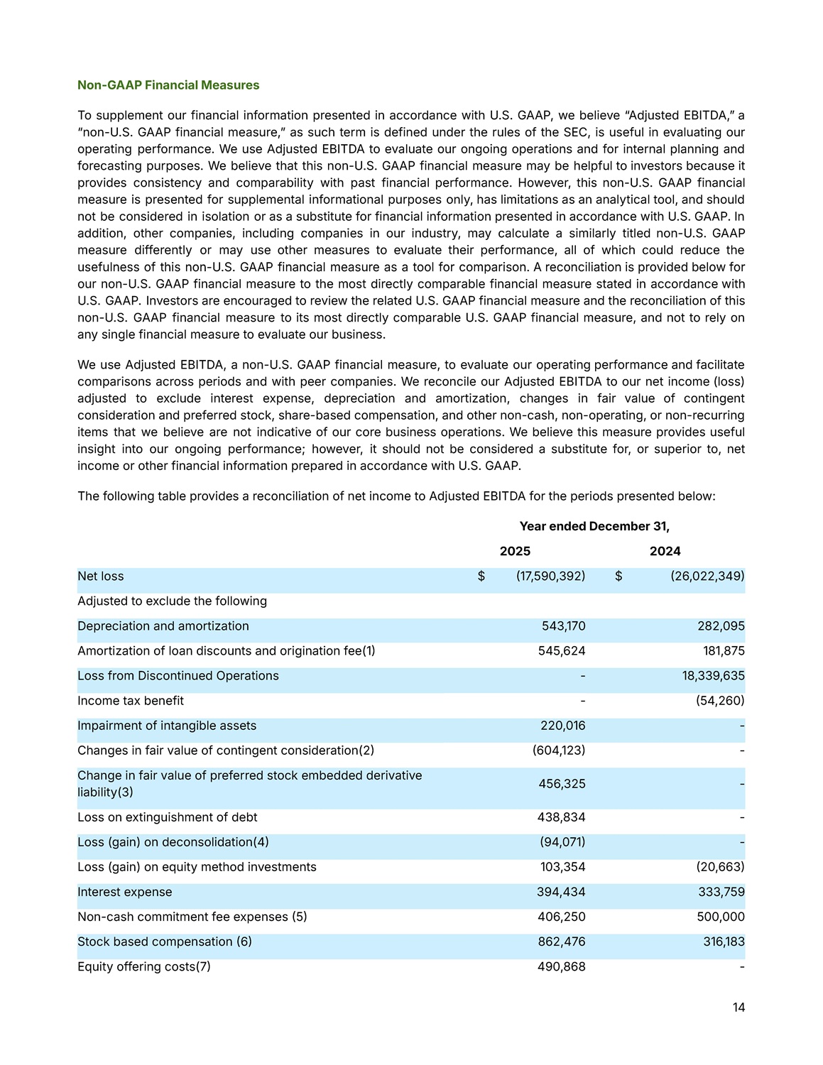 14 Year ended December 31, 2024 2025 $  26,022,349  $  17,590,392  Net loss Adjusted to exclude the following 282,095 543,170 Depreciation and amortization 181,875 545,624 Amortization of loan discounts and origination fee(1  18,339,635 - Loss from Discontinued Operations  54,260  - Income tax benefit - 220,016 Impairment of intangible assets -  604,123  Changes in fair value of contingent consideration(2  - 456,325 Change in fair value of preferred stock embedded derivative liability(3  - 438,834 Loss on extinguishment of debt -  94,071  Loss (gain) on deconsolidation(4   20,663  103,354 Loss (gain) on equity method investments 333,759 394,434 Interest expense 500,000 406,250 Non - cash commitment fee expenses  5  316,183 862,476 Stock based compensation  6  - 490,868 Equity offering costs(7  Non - GAAP Financial Measures To supplement our financial information presented in accordance with U . S . GAAP, we believe “Adjusted EBITDA,ˮ a “non - U . S . GAAP financial measure,ˮ as such term is defined under the rules of the SEC, is useful in evaluating our operating performance . We use Adjusted EBITDA to evaluate our ongoing operations and for internal planning and forecasting purposes . We believe that this non - U . S . GAAP financial measure may be helpful to investors because it provides consistency and comparability with past financial performance . However, this non - U . S . GAAP financial measure is presented for supplemental informational purposes only, has limitations as an analytical tool, and should not be considered in isolation or as a substitute for financial information presented in accordance with U . S . GAAP . In addition, other companies, including companies in our industry, may calculate a similarly titled non - U . S . GAAP measure differently or may use other measures to evaluate their performance, all of which could reduce the usefulness of this non - U . S . GAAP financial measure as a tool for comparison . A reconciliation is provided below for our non - U . S . GAAP financial measure to the most directly comparable financial measure stated in accordance with U . S . GAAP . Investors are encouraged to review the related U . S . GAAP financial measure and the reconciliation of this non - U . S . GAAP financial measure to its most directly comparable U . S . GAAP financial measure, and not to rely on any single financial measure to evaluate our business . We use Adjusted EBITDA, a non - U . S . GAAP financial measure, to evaluate our operating performance and facilitate comparisons across periods and with peer companies . We reconcile our Adjusted EBITDA to our net income (loss) adjusted to exclude interest expense, depreciation and amortization, changes in fair value of contingent consideration and preferred stock, share - based compensation, and other non - cash, non - operating, or non - recurring items that we believe are not indicative of our core business operations . We believe this measure provides useful insight into our ongoing performance ; however, it should not be considered a substitute for, or superior to, net income or other financial information prepared in accordance with U . S . GAAP . The following table provides a reconciliation of net income to Adjusted EBITDA for the periods presented below :