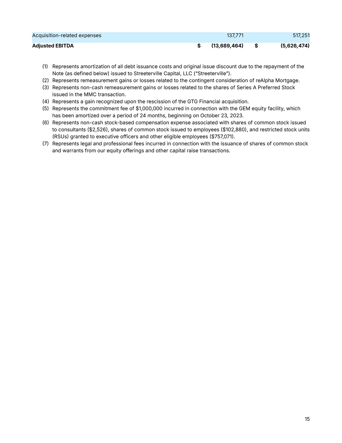 15 517,251 137,771 Acquisition - related expenses $  5,626,474  $  13,689,464  Adjusted EBITDA  1  Represents amortization of all debt issuance costs and original issue discount due to the repayment of the Note (as defined below) issued to Streeterville Capital, LLC (“Streetervilleˮ).  2  Represents remeasurement gains or losses related to the contingent consideration of reAlpha Mortgage.  3  Represents non - cash remeasurement gains or losses related to the shares of Series A Preferred Stock issued in the MMC transaction.  4  Represents a gain recognized upon the rescission of the GTG Financial acquisition.  5  Represents the commitment fee of $1,000,000 incurred in connection with the GEM equity facility, which has been amortized over a period of 24 months, beginning on October 23, 2023.  6  Represents non - cash stock - based compensation expense associated with shares of common stock issued to consultants  $2,526  , shares of common stock issued to employees  $102,880  , and restricted stock units  RSUs  granted to executive officers and other eligible employees  $757,071  .  7  Represents legal and professional fees incurred in connection with the issuance of shares of common stock and warrants from our equity offerings and other capital raise transactions.