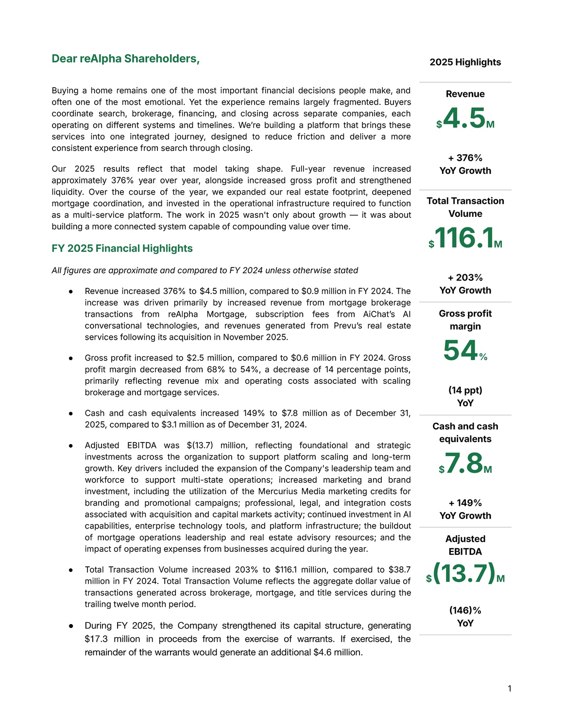 1 Dear reAlpha Shareholders, Buying a home remains one of the most important financial decisions people make, and often one of the most emotional . Yet the experience remains largely fragmented . Buyers coordinate search, brokerage, financing, and closing across separate companies, each operating on different systems and timelines . Weʼre building a platform that brings these services into one integrated journey, designed to reduce friction and deliver a more consistent experience from search through closing . Our 2025 results reflect that model taking shape . Full - year revenue increased approximately 376 % year over year, alongside increased gross profit and strengthened liquidity . Over the course of the year, we expanded our real estate footprint, deepened mortgage coordination, and invested in the operational infrastructure required to function as a multi - service platform . The work in 2025 wasn't only about growth — it was about building a more connected system capable of compounding value over time . FY 2025 Financial Highlights All figures are approximate and compared to FY 2024 unless otherwise stated ● Revenue increased 376 % to $ 4 . 5 million, compared to $ 0 . 9 million in FY 2024 . The increase was driven primarily by increased revenue from mortgage brokerage transactions from reAlpha Mortgage, subscription fees from AiChatʼs AI conversational technologies, and revenues generated from Prevuʼs real estate services following its acquisition in November 2025 . ● Gross profit increased to $ 2 . 5 million, compared to $ 0 . 6 million in FY 2024 . Gross profit margin decreased from 68 % to 54 % , a decrease of 14 percentage points, primarily reflecting revenue mix and operating costs associated with scaling brokerage and mortgage services . ● Cash and cash equivalents increased 149 % to $ 7 . 8 million as of December 31 , 2025 , compared to $ 3 . 1 million as of December 31 , 2024 . ● Adjusted EBITDA was $  13 . 7  million, reflecting foundational and strategic investments across the organization to support platform scaling and long - term growth . Key drivers included the expansion of the Company's leadership team and workforce to support multi - state operations ; increased marketing and brand investment, including the utilization of the Mercurius Media marketing credits for branding and promotional campaigns ; professional, legal, and integration costs associated with acquisition and capital markets activity ; continued investment in AI capabilities, enterprise technology tools, and platform infrastructure ; the buildout of mortgage operations leadership and real estate advisory resources ; and the impact of operating expenses from businesses acquired during the year . ● Total Transaction Volume increased 203 % to $ 116 . 1 million, compared to $ 38 . 7 million in FY 2024 . Total Transaction Volume reflects the aggregate dollar value of transactions generated across brokerage, mortgage, and title services during the trailing twelve month period . ● During FY 2025, the Company strengthened its capital structure, generating $17.3 million in proceeds from the exercise of warrants. If exercised, the remainder of the warrants would generate an additional $4.6 million. 2025 Highlights Revenue $ 4.5 M + 376% YoY Growth Total Transaction Volume $ 116.1 M + 203% YoY Growth Gross profit margin 54 %  14 ppt) YoY Cash and cash equivalents $ 7.8 M + 149% YoY Growth Adjusted EBITDA $  13.7  M  146  % YoY