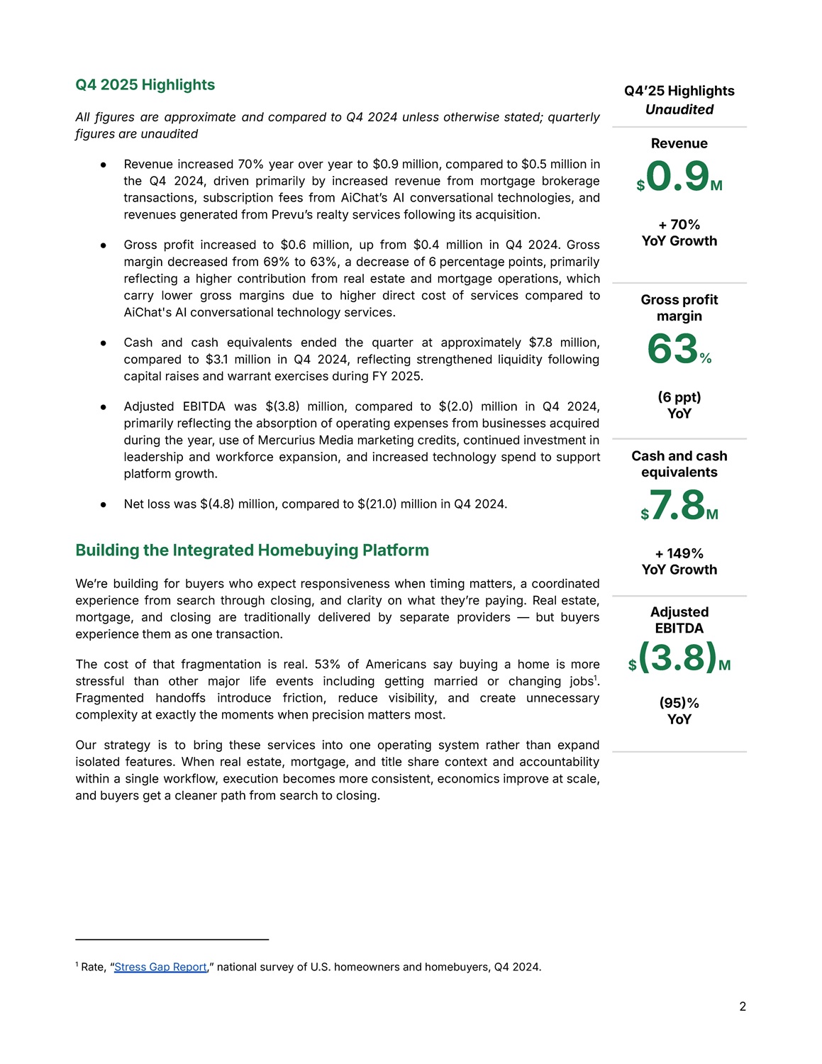 Q 4 2025 Highlights All figures are approximate and compared to Q 4 2024 unless otherwise stated ; quarterly figures are unaudited ● Revenue increased 70 % year over year to $ 0 . 9 million, compared to $ 0 . 5 million in the Q 4 2024 , driven primarily by increased revenue from mortgage brokerage transactions, subscription fees from AiChatʼs AI conversational technologies, and revenues generated from Prevuʼs realty services following its acquisition . ● Gross profit increased to $ 0 . 6 million, up from $ 0 . 4 million in Q 4 2024 . Gross margin decreased from 69 % to 63 % , a decrease of 6 percentage points, primarily reflecting a higher contribution from real estate and mortgage operations, which carry lower gross margins due to higher direct cost of services compared to AiChat's AI conversational technology services . ● Cash and cash equivalents ended the quarter at approximately $ 7 . 8 million, compared to $ 3 . 1 million in Q 4 2024 , reflecting strengthened liquidity following capital raises and warrant exercises during FY 2025 . ● Adjusted EBITDA was $  3 . 8  million, compared to $  2 . 0  million in Q 4 2024 , primarily reflecting the absorption of operating expenses from businesses acquired during the year, use of Mercurius Media marketing credits, continued investment in leadership and workforce expansion, and increased technology spend to support platform growth . ● Net loss was $  4.8  million, compared to $  21.0  million in Q4 2024. Building the Integrated Homebuying Platform Weʼre building for buyers who expect responsiveness when timing matters, a coordinated experience from search through closing, and clarity on what theyʼre paying . Real estate, mortgage, and closing are traditionally delivered by separate providers — but buyers experience them as one transaction . The cost of that fragmentation is real . 53 % of Americans say buying a home is more stressful than other major life events including getting married or changing jobs 1 . Fragmented handoffs introduce friction, reduce visibility, and create unnecessary complexity at exactly the moments when precision matters most . Our strategy is to bring these services into one operating system rather than expand isolated features . When real estate, mortgage, and title share context and accountability within a single workflow, execution becomes more consistent, economics improve at scale, and buyers get a cleaner path from search to closing . 2 1 Rate, “ Stress Gap Report ,ˮ national survey of U.S. homeowners and homebuyers, Q4 2024. Q4ʼ25 Highlights Unaudited Revenue $ 0.9 M + 70% YoY Growth Gross profit margin 63 %  6 ppt) YoY Cash and cash equivalents $ 7.8 M + 149% YoY Growth Adjusted EBITDA $  3.8  M  95  % YoY