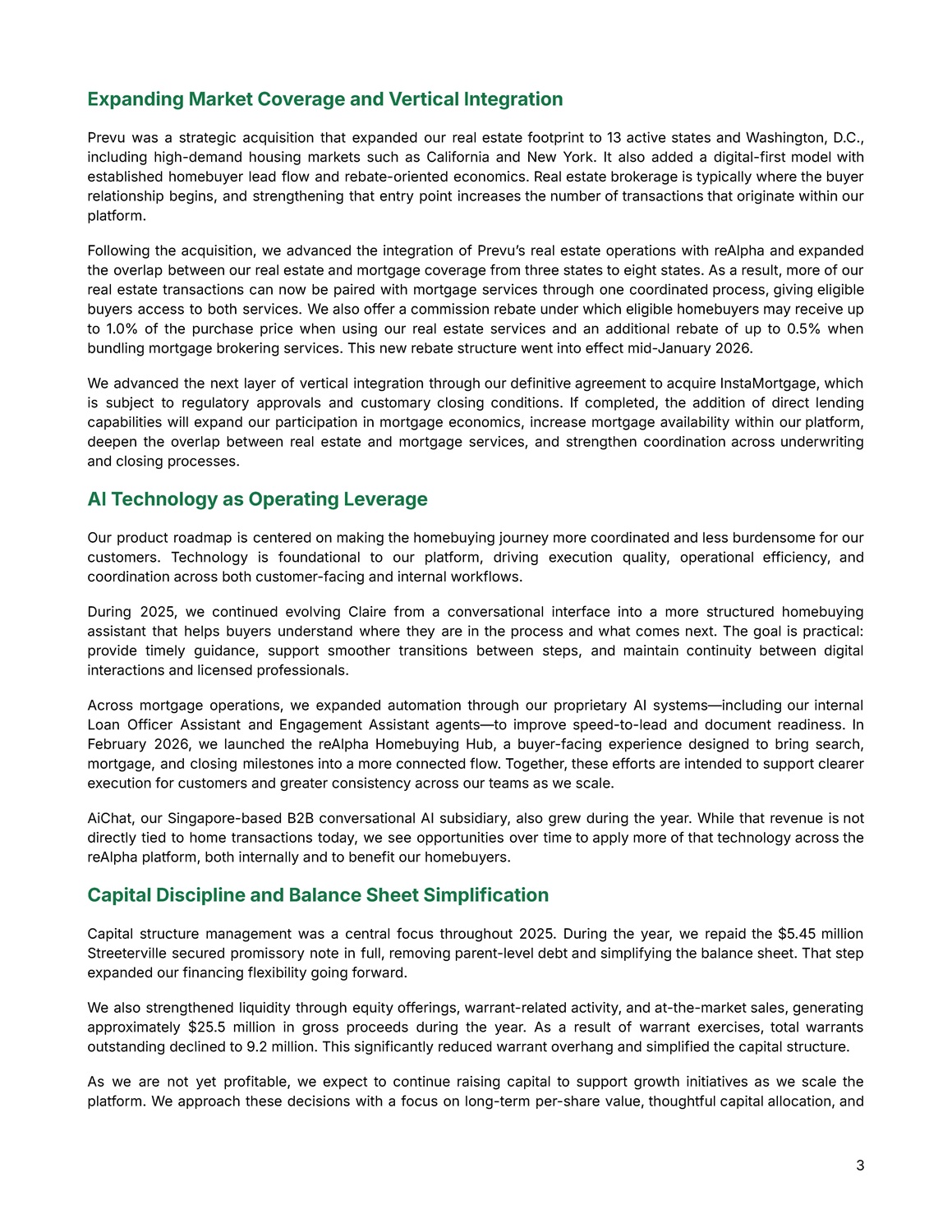 3 Expanding Market Coverage and Vertical Integration Prevu was a strategic acquisition that expanded our real estate footprint to 13 active states and Washington, D . C . , including high - demand housing markets such as California and New York . It also added a digital - first model with established homebuyer lead flow and rebate - oriented economics . Real estate brokerage is typically where the buyer relationship begins, and strengthening that entry point increases the number of transactions that originate within our platform . Following the acquisition, we advanced the integration of Prevuʼs real estate operations with reAlpha and expanded the overlap between our real estate and mortgage coverage from three states to eight states . As a result, more of our real estate transactions can now be paired with mortgage services through one coordinated process, giving eligible buyers access to both services . We also offer a commission rebate under which eligible homebuyers may receive up to 1 . 0 % of the purchase price when using our real estate services and an additional rebate of up to 0 . 5 % when bundling mortgage brokering services . This new rebate structure went into effect mid - January 2026 . We advanced the next layer of vertical integration through our definitive agreement to acquire InstaMortgage, which is subject to regulatory approvals and customary closing conditions . If completed, the addition of direct lending capabilities will expand our participation in mortgage economics, increase mortgage availability within our platform, deepen the overlap between real estate and mortgage services, and strengthen coordination across underwriting and closing processes . AI Technology as Operating Leverage Our product roadmap is centered on making the homebuying journey more coordinated and less burdensome for our customers . Technology is foundational to our platform, driving execution quality, operational efficiency, and coordination across both customer - facing and internal workflows . During 2025 , we continued evolving Claire from a conversational interface into a more structured homebuying assistant that helps buyers understand where they are in the process and what comes next . The goal is practical : provide timely guidance, support smoother transitions between steps, and maintain continuity between digital interactions and licensed professionals . Across mortgage operations, we expanded automation through our proprietary AI systems — including our internal Loan Officer Assistant and Engagement Assistant agents — to improve speed - to - lead and document readiness . In February 2026 , we launched the reAlpha Homebuying Hub, a buyer - facing experience designed to bring search, mortgage, and closing milestones into a more connected flow . Together, these efforts are intended to support clearer execution for customers and greater consistency across our teams as we scale . AiChat, our Singapore - based B 2 B conversational AI subsidiary, also grew during the year . While that revenue is not directly tied to home transactions today, we see opportunities over time to apply more of that technology across the reAlpha platform, both internally and to benefit our homebuyers . Capital Discipline and Balance Sheet Simplification Capital structure management was a central focus throughout 2025 . During the year, we repaid the $ 5 . 45 million Streeterville secured promissory note in full, removing parent - level debt and simplifying the balance sheet . That step expanded our financing flexibility going forward . We also strengthened liquidity through equity offerings, warrant - related activity, and at - the - market sales, generating approximately $ 25 . 5 million in gross proceeds during the year . As a result of warrant exercises, total warrants outstanding declined to 9 . 2 million . This significantly reduced warrant overhang and simplified the capital structure . As we are not yet profitable, we expect to continue raising capital to support growth initiatives as we scale the platform . We approach these decisions with a focus on long - term per - share value, thoughtful capital allocation, and