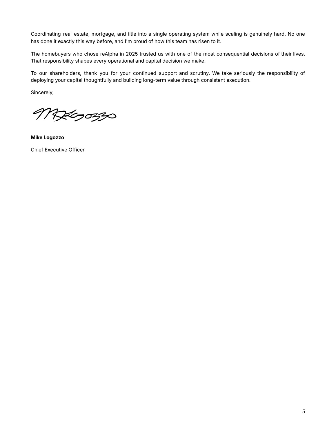 Coordinating real estate, mortgage, and title into a single operating system while scaling is genuinely hard. No one has done it exactly this way before, and I'm proud of how this team has risen to i t . The homebuyers who chose reAlpha in 2025 trusted us with one of the most consequential decisions of their lives. That responsibility shapes every operational and capital decision we make. To our shareholders, thank you for your continued support and scrutiny. We take seriously the responsibility of deploying your capital thoughtfully and building long - term value through consistent execution. Sincerely, Mike Logozzo Chief Executive Officer 5