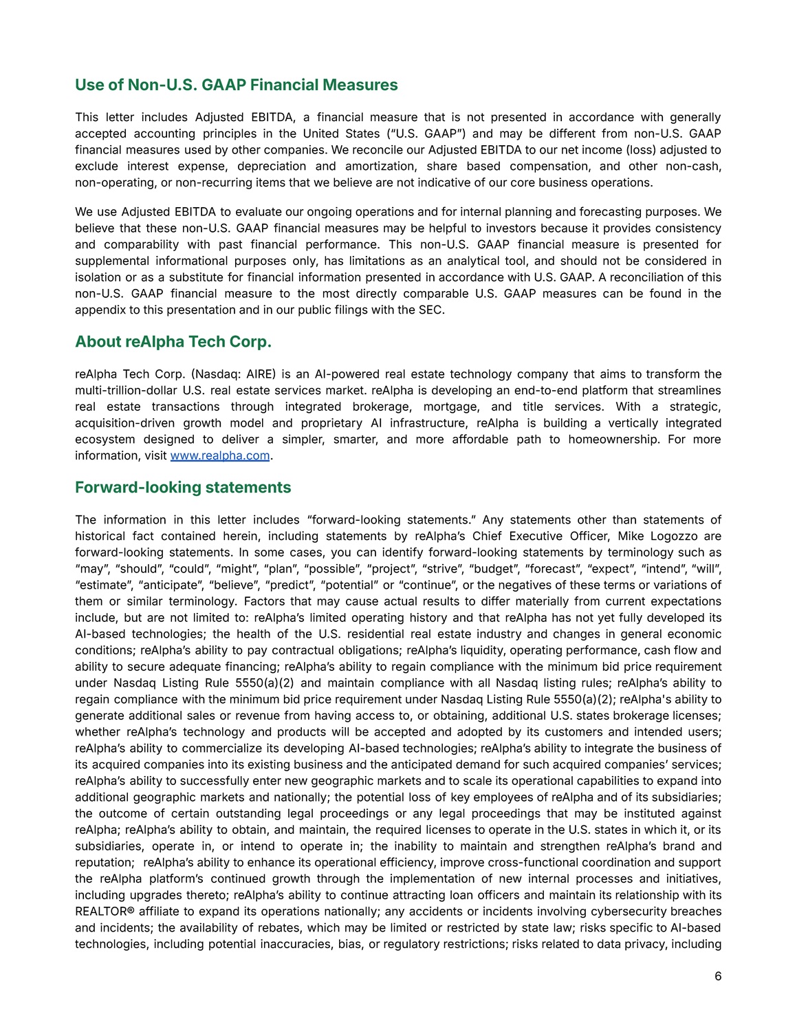 6 Use of Non - U.S. GAAP Financial Measures This letter includes Adjusted EBITDA, a financial measure that is not presented in accordance with generally accepted accounting principles in the United States (“U . S . GAAPˮ) and may be different from non - U . S . GAAP financial measures used by other companies . We reconcile our Adjusted EBITDA to our net income (loss) adjusted to exclude interest expense, depreciation and amortization, share based compensation, and other non - cash, non - operating, or non - recurring items that we believe are not indicative of our core business operations . We use Adjusted EBITDA to evaluate our ongoing operations and for internal planning and forecasting purposes . We believe that these non - U . S . GAAP financial measures may be helpful to investors because it provides consistency and comparability with past financial performance . This non - U . S . GAAP financial measure is presented for supplemental informational purposes only, has limitations as an analytical tool, and should not be considered in isolation or as a substitute for financial information presented in accordance with U . S . GAAP . A reconciliation of this non - U . S . GAAP financial measure to the most directly comparable U . S . GAAP measures can be found in the appendix to this presentation and in our public filings with the SEC . About reAlpha Tech Corp. reAlpha Tech Corp .  Nasdaq : AIRE  is an AI - powered real estate technology company that aims to transform the multi - trillion - dollar U . S . real estate services market . reAlpha is developing an end - to - end platform that streamlines real estate transactions through integrated brokerage, mortgage, and title services . With a strategic, acquisition - driven growth model and proprietary AI infrastructure, reAlpha is building a vertically integrated ecosystem designed to deliver a simpler, smarter, and more affordable path to homeownership . For more information, visit www . realpha . com . Forward - looking statements The information in this letter includes “forward - looking statements . ˮ Any statements other than statements of historical fact contained herein, including statements by reAlphaʼs Chief Executive Officer, Mike Logozzo are forward - looking statements . In some cases, you can identify forward - looking statements by terminology such as “mayˮ, “shouldˮ, “couldˮ, “mightˮ, “planˮ, “possibleˮ, “projectˮ, “striveˮ, “budgetˮ, “forecastˮ, “expectˮ, “intendˮ, “willˮ, “estimateˮ, “anticipateˮ, “believeˮ, “predictˮ, “potentialˮ or “continueˮ, or the negatives of these terms or variations of them or similar terminology . Factors that may cause actual results to differ materially from current expectations include, but are not limited to : reAlphaʼs limited operating history and that reAlpha has not yet fully developed its AI - based technologies ; the health of the U . S . residential real estate industry and changes in general economic conditions ; reAlphaʼs ability to pay contractual obligations ; reAlphaʼs liquidity, operating performance, cash flow and ability to secure adequate financing ; reAlphaʼs ability to regain compliance with the minimum bid price requirement under Nasdaq Listing Rule 5550 (a)( 2 ) and maintain compliance with all Nasdaq listing rules ; reAlphaʼs ability to regain compliance with the minimum bid price requirement under Nasdaq Listing Rule 5550 (a)( 2 ) ; reAlpha's ability to generate additional sales or revenue from having access to, or obtaining, additional U . S . states brokerage licenses ; whether reAlphaʼs technology and products will be accepted and adopted by its customers and intended users ; reAlphaʼs ability to commercialize its developing AI - based technologies ; reAlphaʼs ability to integrate the business of its acquired companies into its existing business and the anticipated demand for such acquired companiesʼ services ; reAlphaʼs ability to successfully enter new geographic markets and to scale its operational capabilities to expand into additional geographic markets and nationally ; the potential loss of key employees of reAlpha and of its subsidiaries ; the outcome of certain outstanding legal proceedings or any legal proceedings that may be instituted against reAlpha ; reAlphaʼs ability to obtain, and maintain, the required licenses to operate in the U . S . states in which it, or its subsidiaries, operate in, or intend to operate in ; the inability to maintain and strengthen reAlphaʼs brand and reputation ; reAlphaʼs ability to enhance its operational efficiency, improve cross - functional coordination and support the reAlpha platformʼs continued growth through the implementation of new internal processes and initiatives, including upgrades thereto ; reAlphaʼs ability to continue attracting loan officers and maintain its relationship with its REALTOR® affiliate to expand its operations nationally ; any accidents or incidents involving cybersecurity breaches and incidents ; the availability of rebates, which may be limited or restricted by state law ; risks specific to AI - based technologies, including potential inaccuracies, bias, or regulatory restrictions ; risks related to data privacy, including