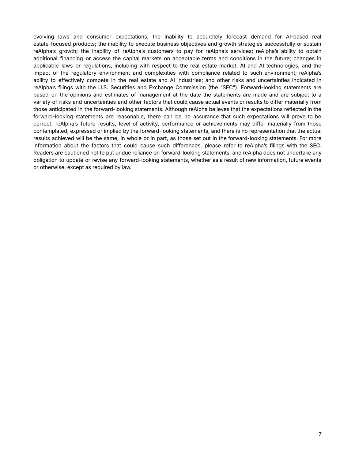 7 evolving laws and consumer expectations ; the inability to accurately forecast demand for AI - based real estate - focused products ; the inability to execute business objectives and growth strategies successfully or sustain reAlphaʼs growth ; the inability of reAlphaʼs customers to pay for reAlphaʼs services ; reAlphaʼs ability to obtain additional financing or access the capital markets on acceptable terms and conditions in the future ; changes in applicable laws or regulations, including with respect to the real estate market, AI and AI technologies, and the impact of the regulatory environment and complexities with compliance related to such environment ; reAlphaʼs ability to effectively compete in the real estate and AI industries ; and other risks and uncertainties indicated in reAlphaʼs filings with the U . S . Securities and Exchange Commission (the “SECˮ) . Forward - looking statements are based on the opinions and estimates of management at the date the statements are made and are subject to a variety of risks and uncertainties and other factors that could cause actual events or results to differ materially from those anticipated in the forward - looking statements . Although reAlpha believes that the expectations reflected in the forward - looking statements are reasonable, there can be no assurance that such expectations will prove to be correct . reAlphaʼs future results, level of activity, performance or achievements may differ materially from those contemplated, expressed or implied by the forward - looking statements, and there is no representation that the actual results achieved will be the same, in whole or in part, as those set out in the forward - looking statements . For more information about the factors that could cause such differences, please refer to reAlphaʼs filings with the SEC . Readers are cautioned not to put undue reliance on forward - looking statements, and reAlpha does not undertake any obligation to update or revise any forward - looking statements, whether as a result of new information, future events or otherwise, except as required by law .