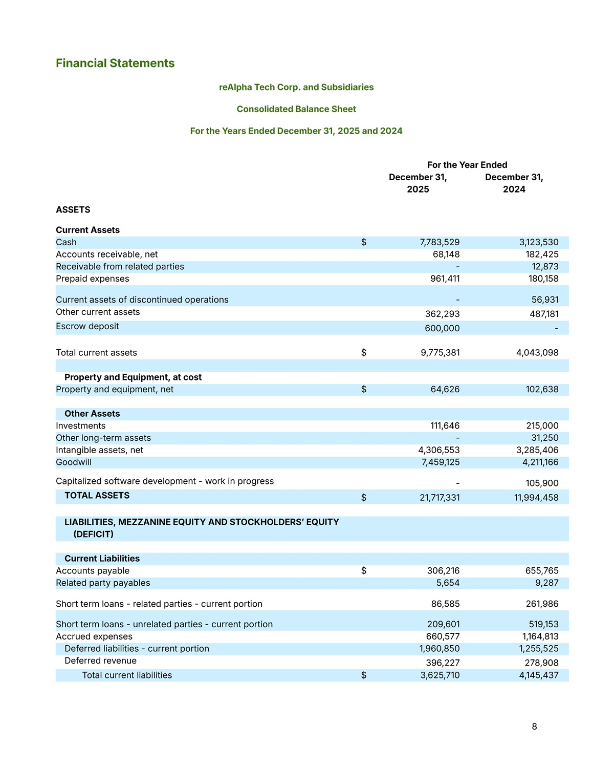 8 For the Year Ended December 31, 2024 December 31, 2025 ASSETS Current Assets 3,123,530 7,783,529 $ Cash 182,425 68,148 Accounts receivable, net 12,873 - Receivable from related parties 180,158 961,411 Prepaid expenses 56,931 - Current assets of discontinued operations 487,181 362,293 Other current assets - 600,000 Escrow deposit 4,043,098 9,775,381 $ Total current assets Property and Equipment, at cost 102,638 64,626 $ Property and equipment, net Other Assets 215,000 111,646 Investments 31,250 - Other long - term assets 3,285,406 4,306,553 Intangible assets, net 4,211,166 7,459,125 Goodwill 105,900 - Capitalized software development - work in progress 11,994,458 21,717,331 $ TOTAL ASSETS LIABILITIES, MEZZANINE EQUITY AND STOCKHOLDERSʼ EQUITY  DEFICIT  Current Liabilities 655,765 306,216 $ Accounts payable 9,287 5,654 Related party payables 261,986 86,585 Short term loans - related parties - current portion 519,153 209,601 Short term loans - unrelated parties - current portion 1,164,813 660,577 Accrued expenses 1,255,525 1,960,850 Deferred liabilities - current portion 278,908 396,227 Deferred revenue 4,145,437 3,625,710 $ Total current liabilities Financial Statements reAlpha Tech Corp. and Subsidiaries Consolidated Balance Sheet For the Years Ended December 31, 2025 and 2024