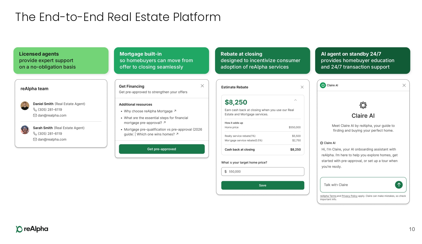 AI agent on standby 24/7 provides homebuyer education and 24/7 transaction support The End - to - End Real Estate Platform 10 Mortgage built - in so homebuyers can move from offer to closing seamlessly Rebate at closing designed to incentivize consumer adoption of reAlpha services Licensed agents provide expert support on a no - obligation basis