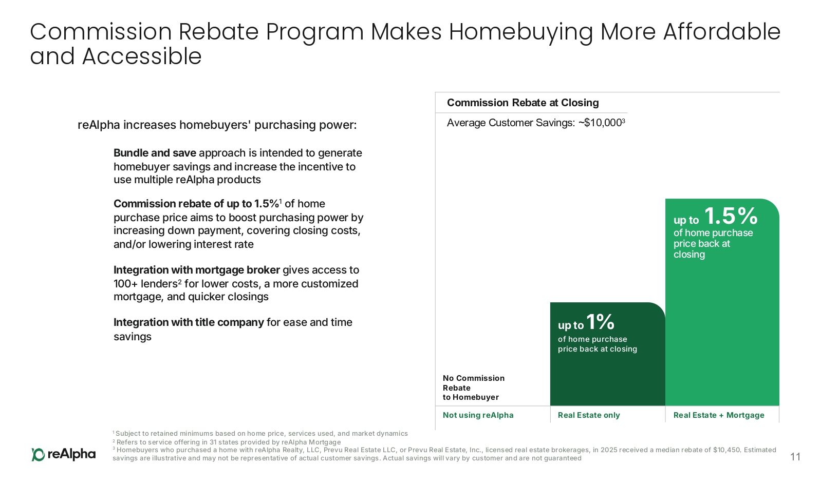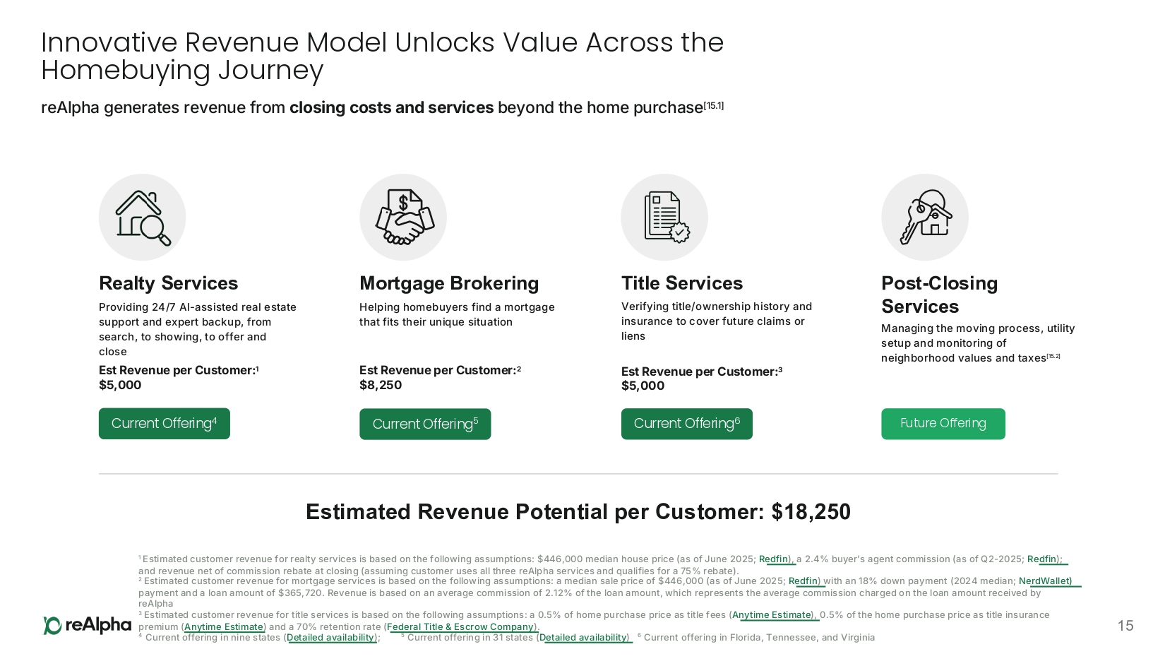 Innovative Revenue Model Unlocks Value Across the Homebuying Journey reAlpha generates revenue from closing costs and services beyond the home purchase [15.1] 1 Estimated customer revenue for realty services is based on the following assumptions: $446,000 median house price (as of June 2025; R edfin ), a 2.4% buyer’s agent commission (as of Q2 - 2025; Re dfin ); and revenue net of commission rebate at closing (assuming customer uses all three reAlpha services and qualifies for a 75% rebate). 2 Estimated customer revenue for mortgage services is based on the following assumptions: a median sale price of $446,000 (as of June 2025; R edfin ) with an 18% down payment (2024 median; Ne rdWallet) payment and a loan amount of $365,720. Revenue is based on an average commission of 2.12% of the loan amount, which represents the average commission charged on the loan amount received by reAlpha 3 Estimated customer revenue for title services is based on the following assumptions: a 0.5% of home purchase price as title fees ( A nytime Estimate ), 0.5% of the home purchase price as title insurance premium ( Anytime Estimate ) and a 70% retention rate ( F ederal Title s Escrow Company ). 4 Current offering in nine states ( Detailed availability ); 5 Current offering in 31 states ( D etailed availability ) 6 Current offering in Florida, Tennessee, and Virginia Estimated Revenue Potential per Customer: $18,250 Mortgage Brokering Helping homebuyers find a mortgage that fits their unique situation Current Offering 5 Est Revenue per Customer: 2 $8,250 Realty Services Providing 24/7 AI - assisted real estate support and expert backup, from search, to showing, to offer and close Est Revenue per Customer: 1 $5,000 Current Offering 4 Title Services Verifying title/ownership history and insurance to cover future claims or liens Current Offering 6 Est Revenue per Customer: 3 $5,000 Post - Closing Services Managing the moving process, utility setup and monitoring of neighborhood values and taxes [15.2] Future Offering 15