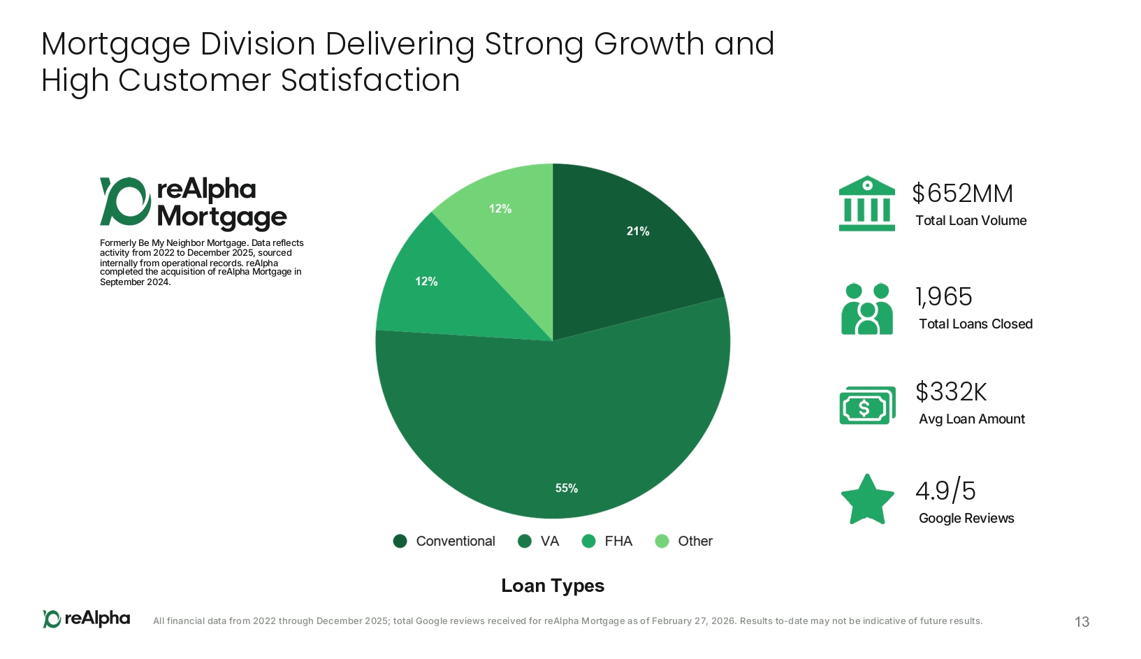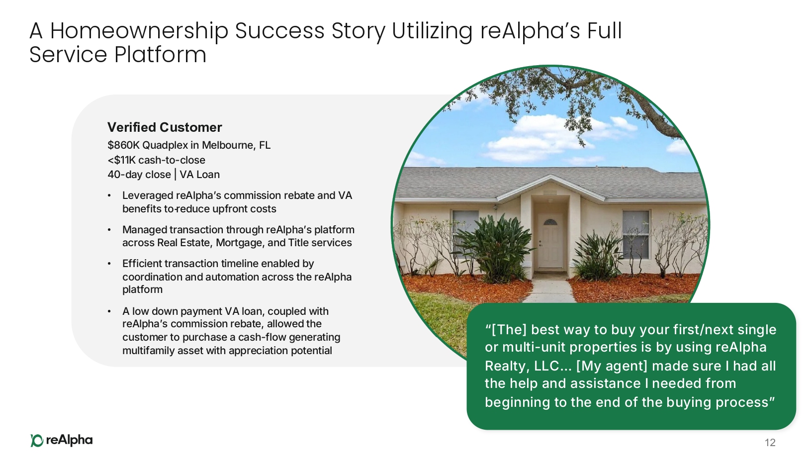 12 A Homeownership Success Story Utilizing reAlpha’s Full Service Platform Verified Customer $860K Quadplex in Melbourne, FL <$11K cash - to - close 40 - day close | VA Loan • Leveraged reAlpha’s commission rebate and VA benefits to reduce upfront costs • Managed transaction through reAlpha’s platform across Real Estate, Mortgage, and Title services • Efficient transaction timeline enabled by coordination and automation across the reAlpha platform • A low down payment VA loan, coupled with reAlpha’s commission rebate, allowed the customer to purchase a cash - flow generating multifamily asset with appreciation potential “[The] best way to buy your first/next single or multi - unit properties is by using reAlpha Realty, LLC… [My agent] made sure I had all the help and assistance I needed from beginning to the end of the buying process”