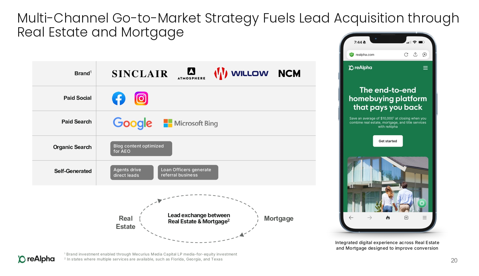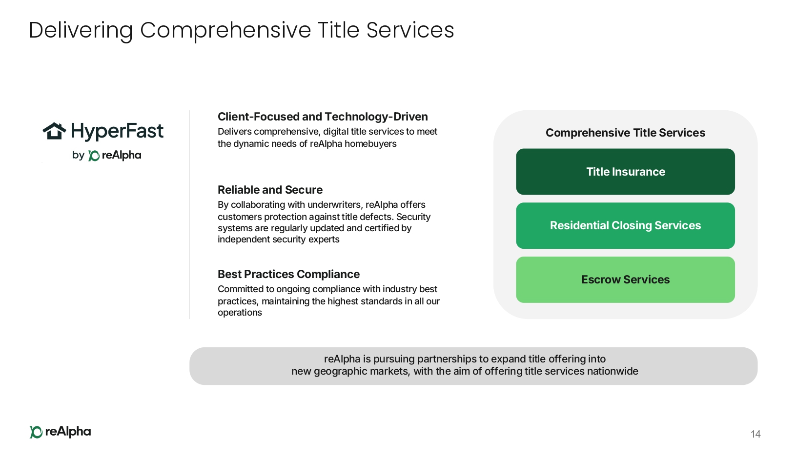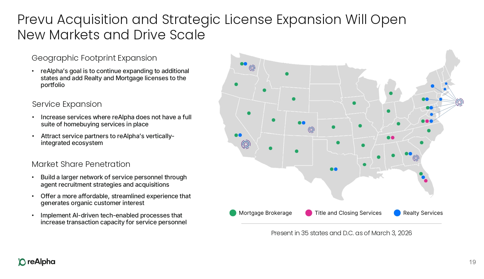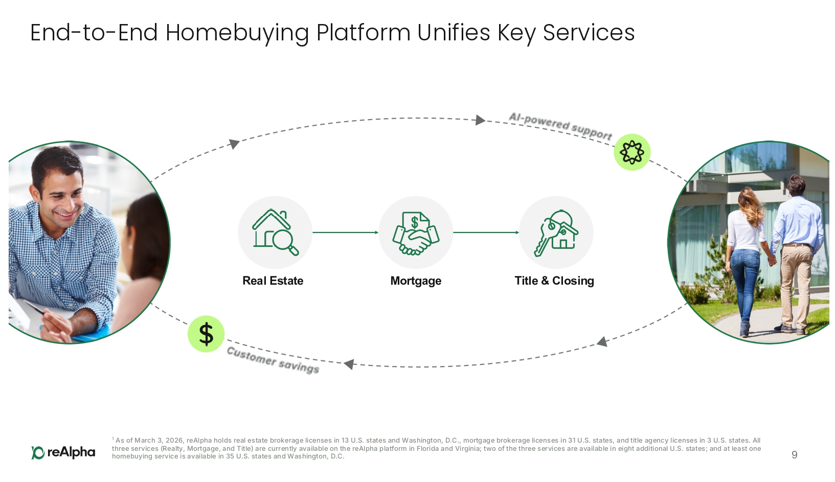 End - to - End Homebuying Platform Unifies Key Services 9 Mortgage Real Estate Title & Closing 1 As of March 3 , 2026 , reAlpha holds real estate brokerage licenses in 13 U . S . states and Washington, D . C . , mortgage brokerage licenses in 31 U . S . states, and title agency licenses in 3 U . S . states . All three services (Realty, Mortgage, and Title) are currently available on the reAlpha platform in Florida and Virginia ; two of the three services are available in eight additional U . S . states ; and at least one homebuying service is available in 35 U . S . states and Washington, D . C .