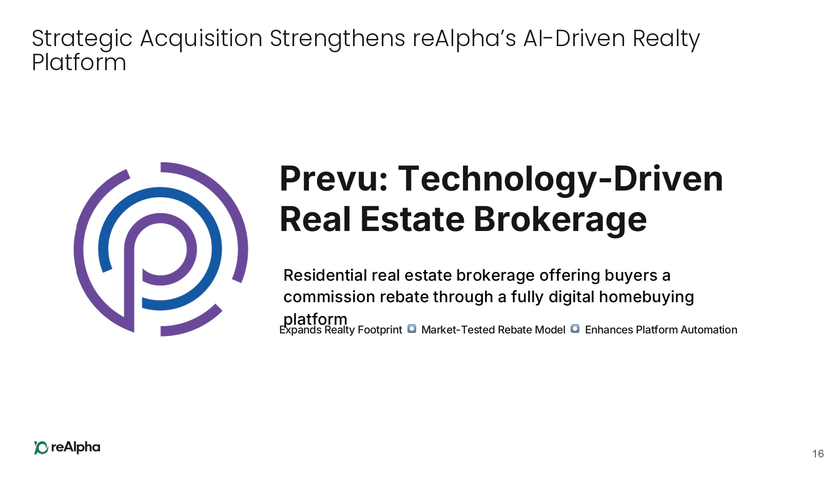 Prevu: Technology - Driven Real Estate Brokerage Residential real estate brokerage offering buyers a commission rebate through a fully digital homebuying platform Strategic Acquisition Strengthens reAlpha’s AI - Driven Realty Platform Expands Realty Footprint Market - Tested Rebate Model Enhances Platform Automation 16
