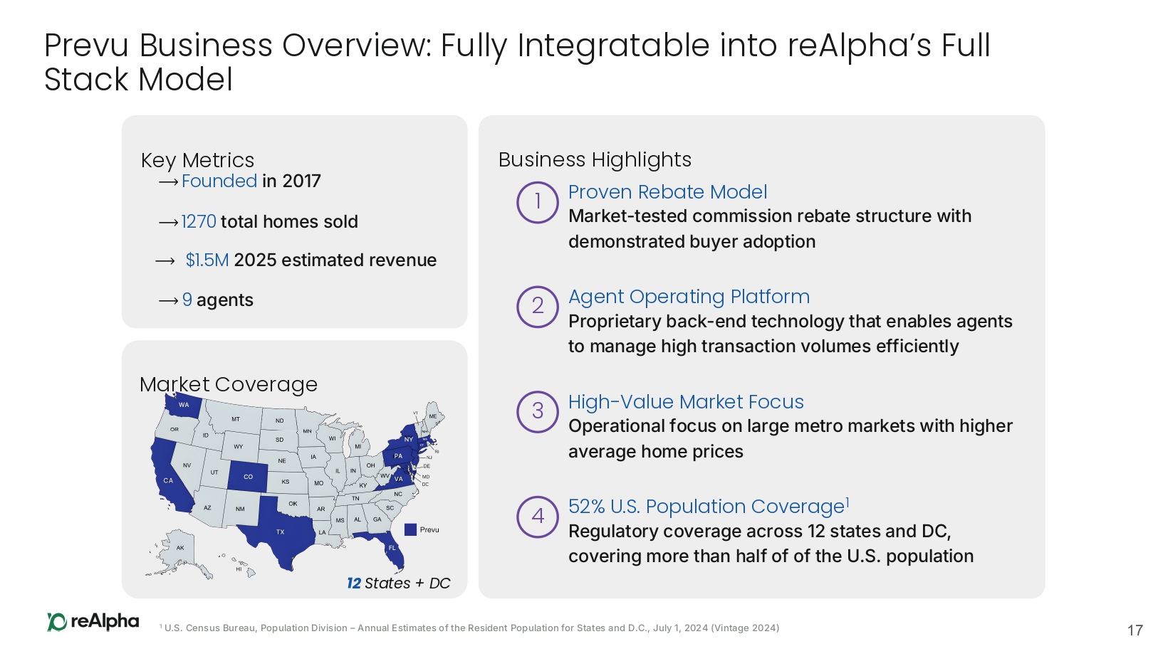 Prevu Business Overview: Fully Integratable into reAlpha’s Full Stack Model 1 U.S. Census Bureau, Population Division – Annual Estimates of the Resident Population for States and D.C., July 1, 2024 (Vintage 2024) Market Coverage Key Metrics ⟶ Founded in 2017 ⟶ 1270 total homes sold ⟶ $1.5M 2025 estimated revenue ⟶ 9 agents Business Highlights Proven Rebate Model 12 States + DC Market - tested commission rebate structure with demonstrated buyer adoption 1 Agent Operating Platform Proprietary back - end technology that enables agents to manage high transaction volumes efficiently 2 High - Value Market Focus Operational focus on large metro markets with higher average home prices 3 52% U.S. Population Coverage 1 Regulatory coverage across 12 states and DC, covering more than half of of the U.S. population 4 17