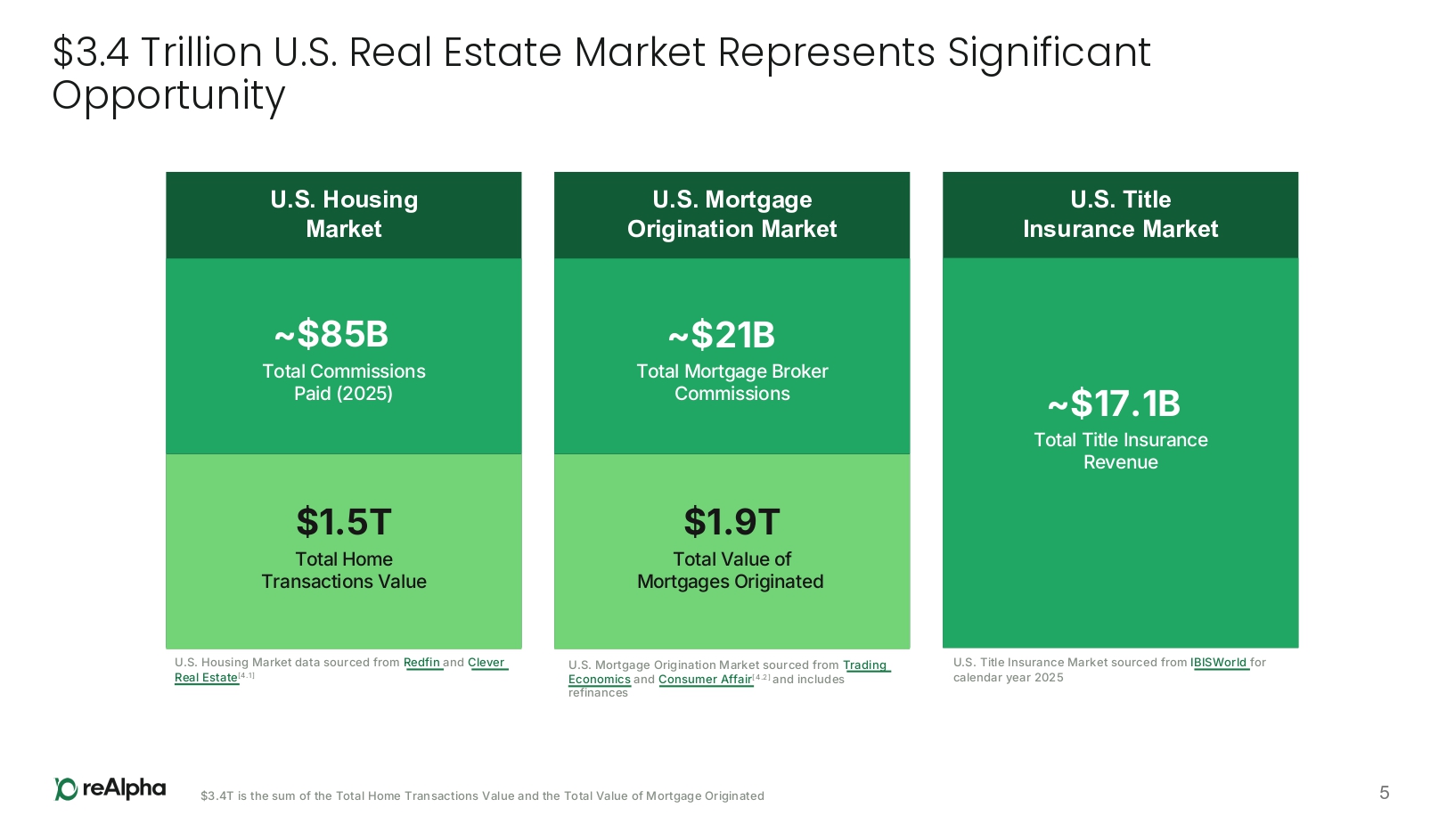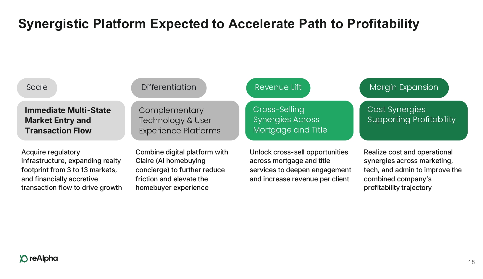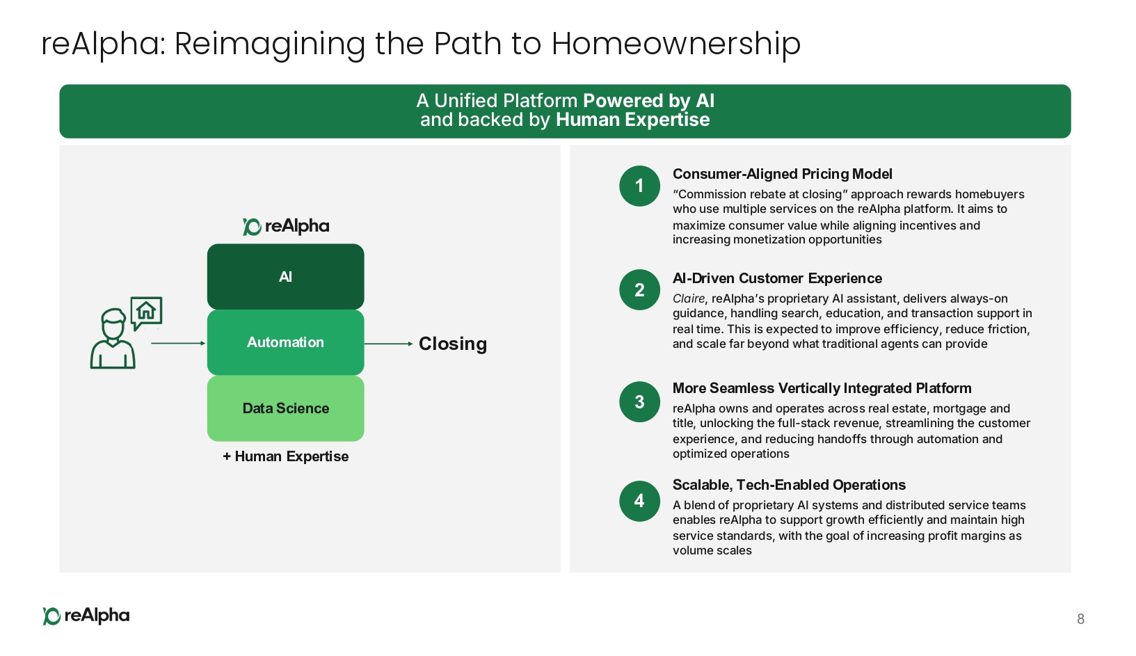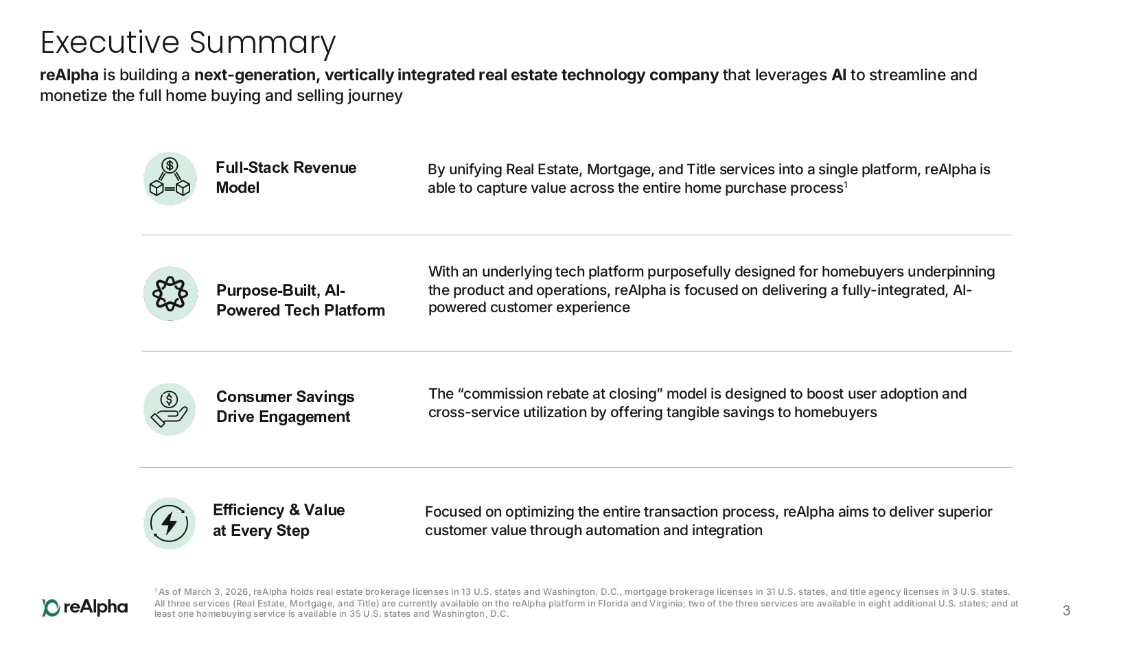 Executive Summary reAlpha is building a next - generation, vertically integrated real estate technology company that leverages AI to streamline and monetize the full home buying and selling journey 3 By unifying Real Estate, Mortgage, and Title services into a single platform, reAlpha is able to capture value across the entire home purchase process 1 Focused on optimizing the entire transaction process, reAlpha aims to deliver superior customer value through automation and integration The “commission rebate at closing” model is designed to boost user adoption and cross - service utilization by offering tangible savings to homebuyers With an underlying tech platform purposefully designed for homebuyers underpinning the product and operations, reAlpha is focused on delivering a fully - integrated, AI - powered customer experience 1 As of March 3, 2026, reAlpha holds real estate brokerage licenses in 13 U.S. states and Washington, D.C., mortgage brokerage licenses in 31 U.S. states, and title agency licenses in 3 U.S. states. All three services (Real Estate, Mortgage, and Title) are currently available on the reAlpha platform in Florida and Virginia; two of the three services are available in eight additional U.S. states; and at least one homebuying service is available in 35 U.S. states and Washington, D.C. Full - Stack Revenue Model Efficiency & Value at Every Step Consumer Savings Drive Engagement Purpose - Built, AI - Powered Tech Platform