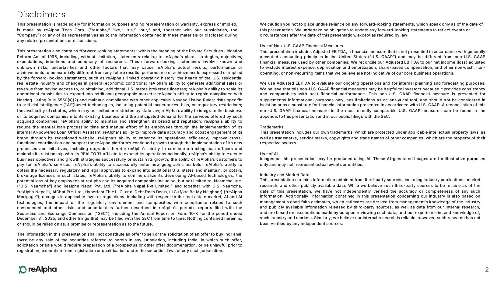 Disclaimers This presentation is made solely for information purposes and no representation or warranty, express or implied, is made by reAlpha Tech Corp . (“reAlpha,” “we,” “us,” “our,” and, together with our subsidiaries, the “Company”) or any of its representatives as to the information contained in these materials or disclosed during any related presentations or discussions . This presentation also contains “forward - looking statements” within the meaning of the Private Securities Litigation Reform Act of 1995 , including, without limitation, statements relating to reAlpha’s plans, strategies, objectives, expectations, intentions and adequacy of resources . These forward - looking statements involve known and unknown risks, uncertainties and other factors that may cause reAlpha’s actual results, performance or achievements to be materially different from any future results, performance or achievements expressed or implied by the forward - looking statements, such as reAlpha’s limited operating history ; the health of the U . S . residential real estate industry and changes in general economic conditions ; reAlpha’s ability to generate additional sales or revenue from having access to, or obtaining, additional U . S . states brokerage licenses ; reAlpha’s ability to scale its operational capabilities to expand into additional geographic markets ; reAlpha’s ability to regain compliance with Nasdaq Listing Rule 5550 (a)( 2 ) and maintain compliance with other applicable Nasdaq Listing Rules ; risks specific to artificial intelligence ("AI")based technologies, including potential inaccuracies, bias, or regulatory restrictions ; the availability of rebates, which may be limited or restricted by state law ; reAlpha's ability to integrate the business of its acquired companies into its existing business and the anticipated demand for the services offered by such acquired companies ; reAlpha’s ability to maintain and strengthen its brand and reputation ; reAlpha’s ability to reduce the manual loan processing time and manual effort of its employees through the implementation of its internal AI - powered Loan Officer Assistant ; reAlpha’s ability to improve data accuracy and boost engagement of its brand through its redesigned website ; reAlpha’s ability to enhance its operational efficiency, improve cross - functional coordination and support the reAlpha platform’s continued growth through the implementation of its new processes and initiatives, including upgrades thereto ; reAlpha’s ability to continue attracting loan officers and maintain its relationship with its REALTOR® affiliate to expand its operations nationally ; reAlpha’s ability to execute business objectives and growth strategies successfully or sustain its growth ; the ability of reAlpha’s customers to pay for reAlpha’s services ; reAlpha’s ability to successfully enter new geographic markets ; reAlpha’s ability to obtain the necessary regulatory and legal approvals to expand into additional U . S . states and maintain, or obtain, brokerage licenses in such states ; reAlpha’s ability to commercialize its developing AI - based technologies ; the potential loss of key employees at reAlpha and its acquired companies including, but not limited to, Naamche, Inc . (“U . S . Naamche”) and Realpha Nepal Pvt . Ltd . (“reAlpha Nepal Pvt Limited,” and together with U . S . Naamche, “reAlpha Nepal”), AiChat Pte . Ltd . , Hyperfast Title LLC, and Debt Does Deals, LLC (f/k/a Be My Neighbor) (“reAlpha Mortgage”) ; changes in applicable laws or regulations, including with respect to the real estate market, AI and AI technologies, the impact of the regulatory environment and complexities with compliance related to such environment and other risks and uncertainties further described in reAlpha's periodic reports filed with the Securities and Exchange Commission ("SEC"), including the Annual Report on Form 10 - K for the period ended December 31 , 2025 , and other filings that may be filed with the SEC from time to time . Nothing contained herein is, or should be relied on as, a promise or representation as to the future . The information in this presentation shall not constitute an offer to sell or the solicitation of an offer to buy, nor shall there be any sale of the securities referred to herein in any jurisdiction, including India, in which such offer, solicitation or sale would require preparation of a prospectus or other offer documentation, or be unlawful prior to registration, exemption from registration or qualification under the securities laws of any such jurisdiction . 2 We caution you not to place undue reliance on any forward - looking statements, which speak only as of the date of this presentation. We undertake no obligation to update any forward - looking statements to reflect events or circumstances after the date of this presentation, except as required by law. Use of Non - U . S . GAAP Financial Measures This presentation includes Adjusted EBITDA, a financial measure that is not presented in accordance with generally accepted accounting principles in the United States (“U . S . GAAP”) and may be different from non - U . S . GAAP financial measures used by other companies . We reconcile our Adjusted EBITDA to our net income (loss) adjusted to exclude interest expense, depreciation and amortization, share - based compensation, and other non - cash, non - operating, or non - recurring items that we believe are not indicative of our core business operations . We use Adjusted EBITDA to evaluate our ongoing operations and for internal planning and forecasting purposes . We believe that this non - U . S . GAAP financial measures may be helpful to investors because it provides consistency and comparability with past financial performance . This non - U . S . GAAP financial measure is presented for supplemental informational purposes only, has limitations 