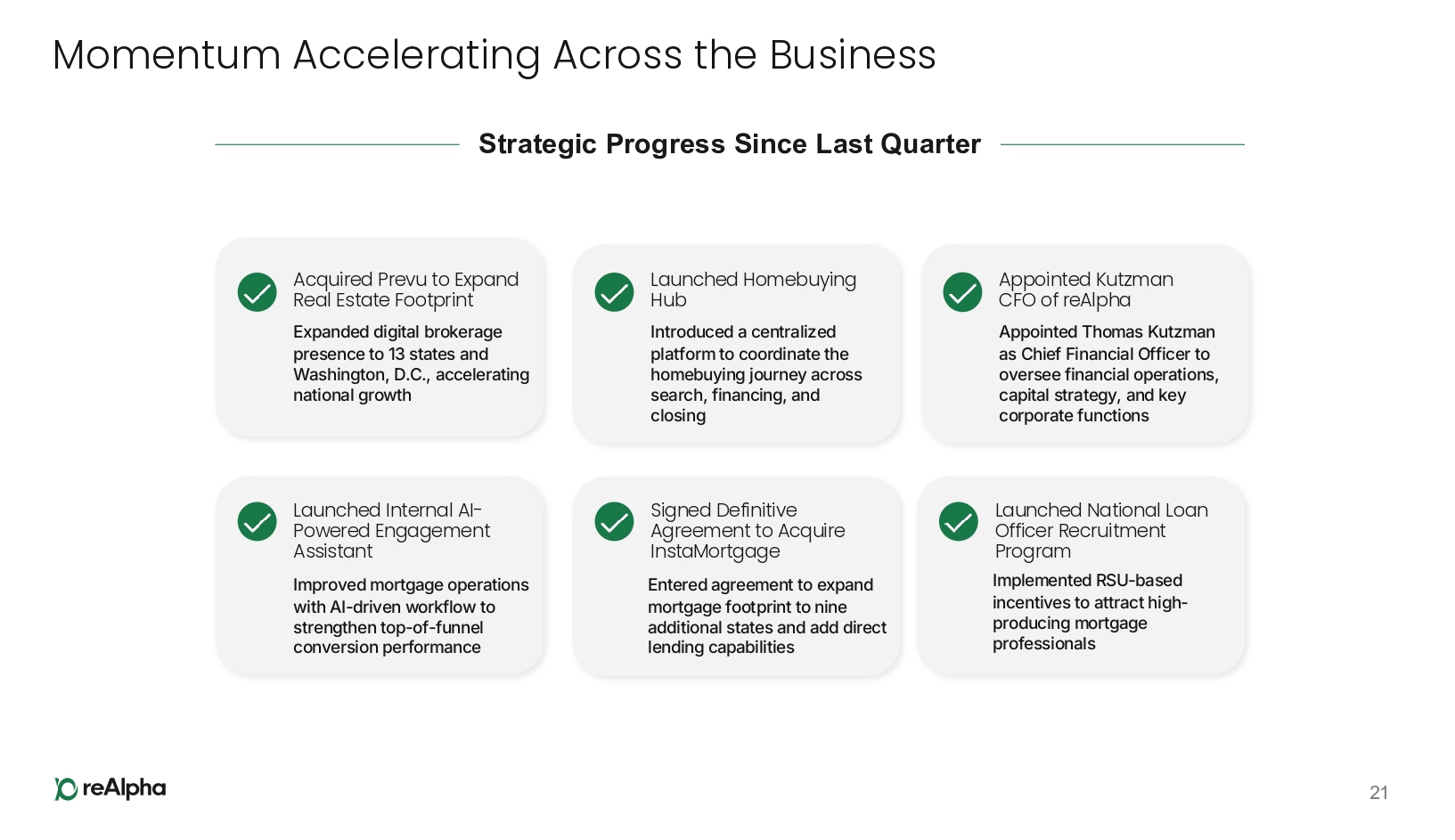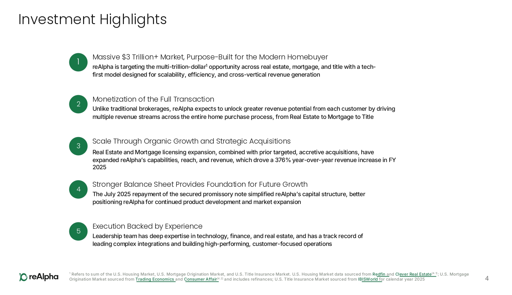 Investment Highlights Massive $3 Trillion+ Market, Purpose - Built for the Modern Homebuyer reAlpha is targeting the multi - trillion - dollar 1 opportunity across real estate, mortgage, and title with a tech - first model designed for scalability, efficiency, and cross - vertical revenue generation 1 Monetization of the Full Transaction Unlike traditional brokerages, reAlpha expects to unlock greater revenue potential from each customer by driving multiple revenue streams across the entire home purchase process, from Real Estate to Mortgage to Title 2 Scale Through Organic Growth and Strategic Acquisitions Real Estate and Mortgage licensing expansion, combined with prior targeted, accretive acquisitions, have expanded reAlpha’s capabilities, reach, and revenue, which drove a 376% year - over - year revenue increase in FY 2025 3 Stronger Balance Sheet Provides Foundation for Future Growth The July 2025 repayment of the secured promissory note simplified reAlpha’s capital structure, better positioning reAlpha for continued product development and market expansion 4 4 1 Refers to sum of the U.S. Housing Market, U.S. Mortgage Origination Market, and U.S. Title Insurance Market. U.S. Housing Market data sourced from Re dfin a nd Cl ever Real Estate [4. 1] ; U.S. Mortgage Origination Market sourced from Trading Economics and Consumer Affair [ 4.2] and includes refinances; U.S. Title Insurance Market sourced from IB ISWorld fo r calendar year 2025 Execution Backed by Experience Leadership team has deep expertise in technology, finance, and real estate, and has a track record of leading complex integrations and building high - performing, customer - focused operations 5
