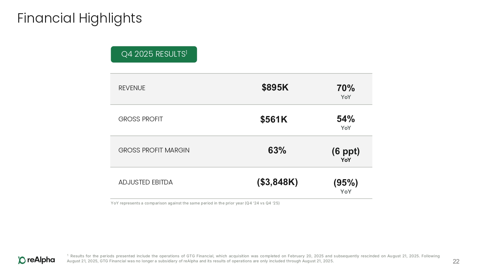Non - U.S. GAAP Reconciliation The following table provides a reconciliation of net income to Adjusted EBITDA for the periods presented in this presentation: 27 (1) Represents amortization of all debt issuance costs and original issue discount due to the repayment of the Note (as defined below) issued to Streeterville Capital, LLC (“Streeterville”). (2) Represents remeasurement gains or losses related to the contingent consideration of reAlpha Mortgage. (3) Represents non - cash remeasurement gains or losses related to the shares of Series A Preferred Stock issued in the MMC transaction. (4) Represents a gain recognized upon the rescission of the GTG Financial acquisition. (5) Represents the commitment fee of $1,000,000 incurred in connection with the GEM equity facility, which has been amortized over a period of 24 months, beginning on October 23, 2023. (6) Represents non - cash stock - based compensation expense associated with shares of common stock issued to consultants ($2,526), shares of common stock issued to employees ($102,880), and restricted stock units (RSUs) granted to executive officers and other eligible employees ($757,071). (7) Represents legal and professional fees incurred in connection with the issuance of shares of common stock and warrants from our equity offerings and other capital raise transactions. Year ended December 31 2024 2025 ($26,022,349) ($17,590,392) Net loss Adjusted to exclude the following: $282,095 $543,170 Depreciation and amortization $181,875 $545,624 Amortization of loan discounts and origination fee (1) $18,339,635 - Loss from Discontinued Operations ($54,260) - Income tax benefit - $220,016 Impairment of intangible assets - ($604,123) Changes in fair value of contingent consideration (2) - $456,325 Change in fair value of preferred stock embedded derivative liability (3) - $438,834 Loss on extinguishment of debt - ($94,071) Loss (gain) on deconsolidation (4) ($20,663) $103,354 Loss (gain) on equity method investments $333,759 $394,434 Interest expense $500,000 $406,250 Non - cash commitment fee expenses (5) $316,183 $862,476 Stock based compensation (6) - $490,868 Equity offering costs (7) $517,251 $137,771 Acquisition - related expenses ($5,626,474) ($13,689,464) Adjusted EBITDA