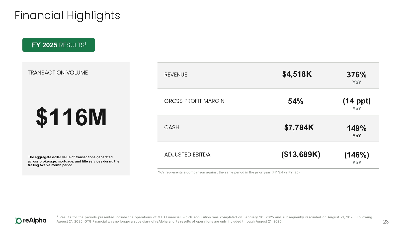 70% $895K REVENUE YoY 54% YoY $561K GROSS PROFIT (6 ppt) 63% GROSS PROFIT MARGIN YoY (95%) ($3,848K) ADJUSTED EBITDA YoY Financial Highlights 22 Q4 2025 RESULTS 1 YoY represents a comparison against the same period in the prior year (Q4 ‘24 vs Q4 ‘25) 1 Results for the periods presented include the operations of GTG Financial, which acquisition was completed on February 20, 2025 and subsequently rescinded on August 21, 2025. Following August 21, 2025, GTG Financial was no longer a subsidiary of reAlpha and its results of operations are only included through August 21, 2025.