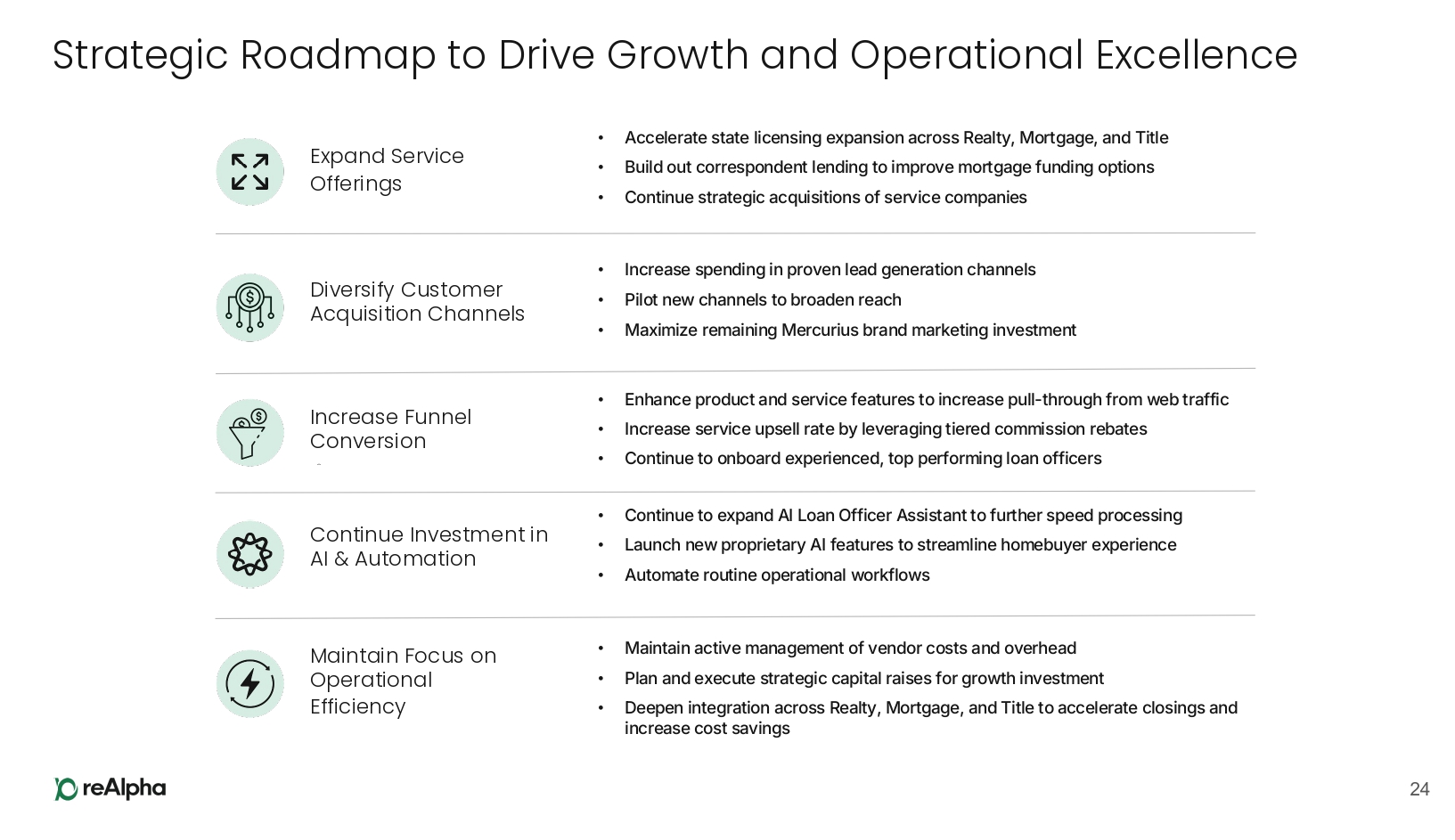376% $4,518K REVENUE YoY (14 ppt) YoY 54% GROSS PROFIT MARGIN 149% $7,784K CASH YoY (146%) ($13,689K) ADJUSTED EBITDA YoY Financial Highlights 23 FY 2025 RESULTS 1 YoY represents a comparison against the same period in the prior year (FY ‘24 vs FY ‘25) 1 Results for the periods presented include the operations of GTG Financial, which acquisition was completed on February 20, 2025 and subsequently rescinded on August 21, 2025. Following August 21, 2025, GTG Financial was no longer a subsidiary of reAlpha and its results of operations are only included through August 21, 2025. TRANSACTION VOLUME $116M The aggregate dollar value of transactions generated across brokerage, mortgage, and title services during the trailing twelve month period