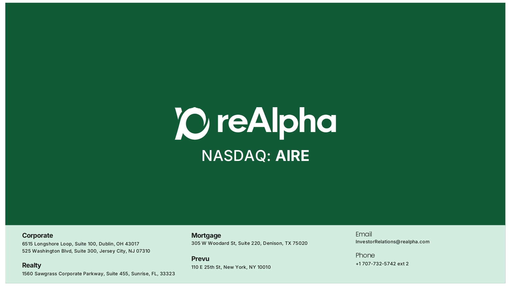 NASDAQ: AIRE Email InvestorRelations@realpha.com Phone +1 707 - 732 - 5742 ext 2 Corporate 6515 Longshore Loop, Suite 100, Dublin, OH 43017 525 Washington Blvd, Suite 300, Jersey City, NJ 07310 Realty 1560 Sawgrass Corporate Parkway, Suite 455, Sunrise, FL, 33323 Mortgage 305 W Woodard St, Suite 220, Denison, TX 75020 Prevu 110 E 25th St, New York, NY 10010