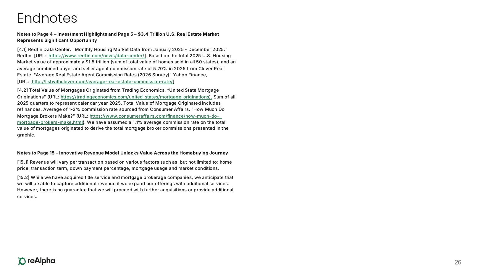 Endnotes 26 Notes to Page 4 – Investment Highlights and Page 5 – $3.4 Trillion U.S. Real Estate Market Represents Significant Opportunity [4.1] Redfin Data Center. "Monthly Housing Market Data from January 2025 - December 2025." Redfin, [URL: https:// www.redfin.com/news/data - center/ ] . Based on the total 2025 U.S. Housing Market value of approximately $1.5 trillion (sum of total value of homes sold in all 50 states), and an average combined buyer and seller agent commission rate of 5.70% in 2025 from Clever Real Estate. "Average Real Estate Agent Commission Rates (2026 Survey)" Yahoo Finance, [URL: http://listwithclever.com/average - real - estate - commission - rate/ ] [4.2] Total Value of Mortgages Originated from Trading Economics. “United State Mortgage Originations” (URL: https://tradingeconomics.com/united - states/mortgage - originations ). Sum of all 2025 quarters to represent calendar year 2025. Total Value of Mortgage Originated includes refinances. Average of 1 - 2% commission rate sourced from Consumer Affairs. “How Much Do Mortgage Brokers Make?” (URL: https:// www.consumeraffairs.com/finance/how - much - do - mortgage - brokers - make.html ). We have assumed a 1.1% average commission rate on the total value of mortgages originated to derive the total mortgage broker commissions presented in the graphic. Notes to Page 15 – Innovative Revenue Model Unlocks Value Across the Homebuying Journey [15.1] Revenue will vary per transaction based on various factors such as, but not limited to: home price, transaction term, down payment percentage, mortgage usage and market conditions. [15.2] While we have acquired title service and mortgage brokerage companies, we anticipate that we will be able to capture additional revenue if we expand our offerings with additional services. However, there is no guarantee that we will proceed with further acquisitions or provide additional services.