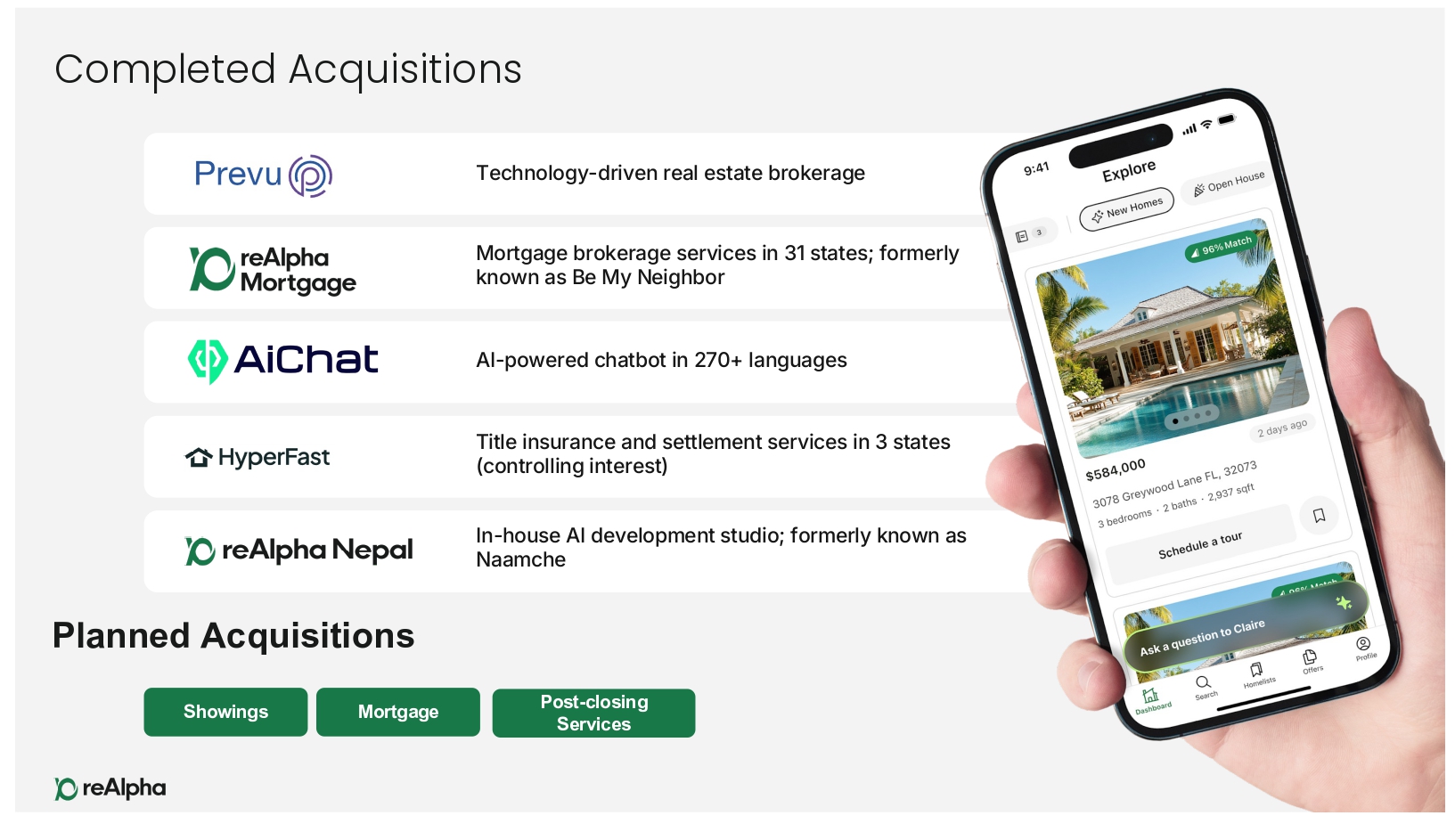 Planned Acquisitions Showings Mortgage Post - closing Services 28 Completed Acquisitions Technology - driven real estate brokerage Mortgage brokerage services in 31 states; formerly known as Be My Neighbor AI - powered chatbot in 270+ languages Title insurance and settlement services in 3 states (controlling interest) In - house AI development studio; formerly known as Naamche
