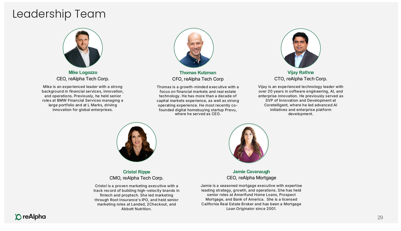Jamie Cavanaugh CEO, reAlpha Mortgage Jamie is a seasoned mortgage executive with expertise leading strategy, growth, and operations. She has held senior roles at Amerifund Home Loans, Prospect Mortgage, and Bank of America. She is a licensed California Real Estate Broker and has been a Mortgage Loan Originator since 2001. Cristol Rippe CMO, reAlpha Tech Corp. Cristol is a proven marketing executive with a track record of building high - velocity brands in fintech and proptech. She led marketing through Root Insurance’s IPO, and held senior marketing roles at Landed, 2Checkout, and Abbott Nutrition. Leadership Team Mike Logozzo CEO, reAlpha Tech Corp. Mike is an experienced leader with a strong background in financial services, innovation, and operations. Previously, he held senior roles at BMW Financial Services managing a large portfolio and at L Marks, driving innovation for global enterprises. 29 Vijay Rathna CTO, reAlpha Tech Corp. Vijay is an experienced technology leader with over 20 years in software engineering, AI, and enterprise innovation. He previously served as SVP of Innovation and Development at Coretelligent, where he led advanced AI initiatives and enterprise platform development. Thomas Kutzman CFO, reAlpha Tech Corp Thomas is a growth - minded executive with a focus on financial markets and real estate technology. He has more than a decade of capital markets experience, as well as strong operating experience. He most recently co - founded digital homebuying startup Prevu, where he served as CEO.