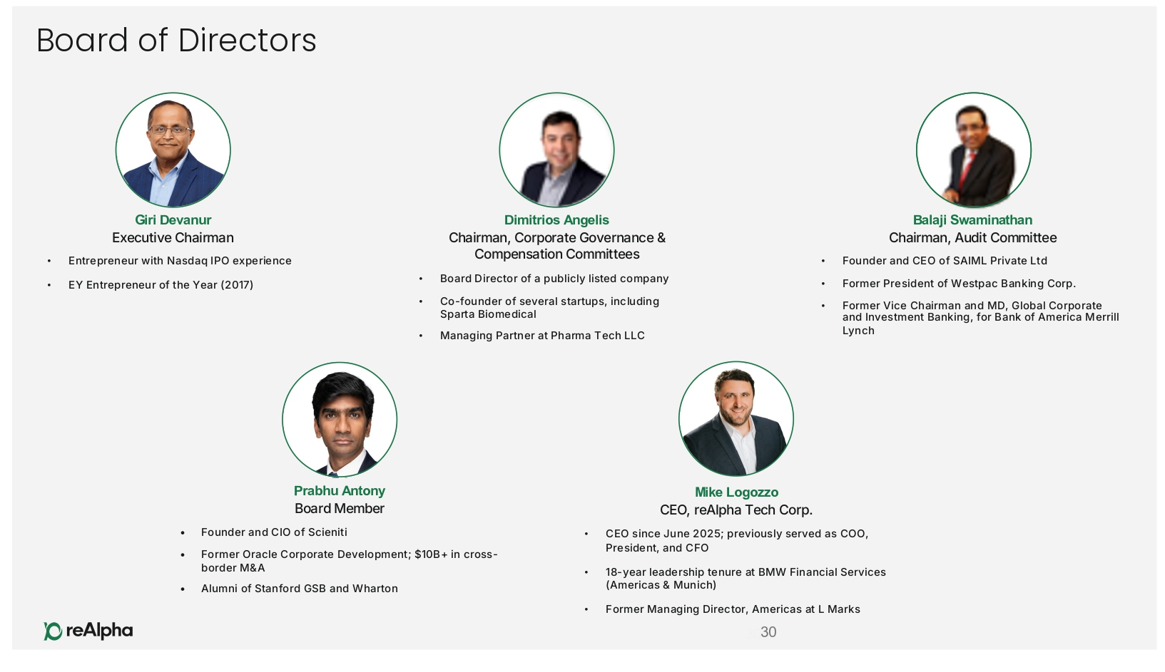 Board of Directors Prabhu Antony Board Member • Founder and CIO of Scieniti • Former Oracle Corporate Development; $10B+ in cross - border MsA • Alumni of Stanford GSB and Wharton Balaji Swaminathan Chairman, Audit Committee • Founder and CEO of SAIML Private Ltd • Former President of Westpac Banking Corp. • Former Vice Chairman and MD, Global Corporate and Investment Banking, for Bank of America Merrill Lynch Giri Devanur Executive Chairman • Entrepreneur with Nasdaq IPO experience • EY Entrepreneur of the Year (2017) Dimitrios Angelis Chairman, Corporate Governance s Compensation Committees • Board Director of a publicly listed company • Co - founder of several startups, including Sparta Biomedical • Managing Partner at Pharma Tech LLC Mike Logozzo CEO, reAlpha Tech Corp. • CEO since June 2025; previously served as COO, President, and CFO • 18 - year leadership tenure at BMW Financial Services (Americas s Munich) • Former Managing Director, Americas at L Marks 30