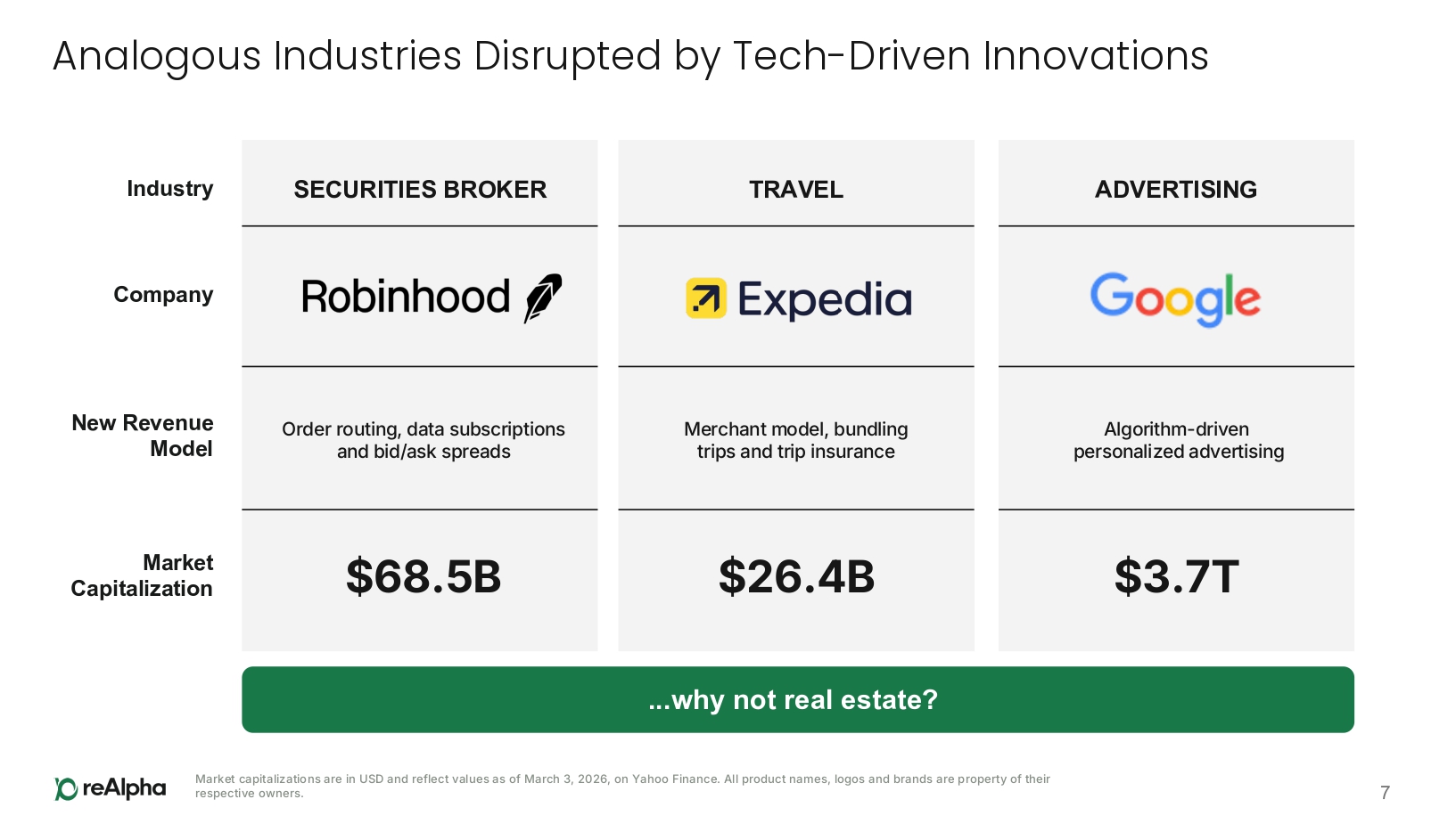SECURITIES BROKER Order routing, data subscriptions and bid/ask spreads $68.5B ADVERTISING Algorithm - driven personalized advertising $3.7T TRAVEL Merchant model, bundling trips and trip insurance $26.4B Analogous Industries Disrupted by Tech - Driven Innovations Industry Company New Revenue Model Market Capitalization 7 ...why not real estate? Market capitalizations are in USD and reflect values as of March 3, 2026, on Yahoo Finance. All product names, logos and brands are property of their respective owners.