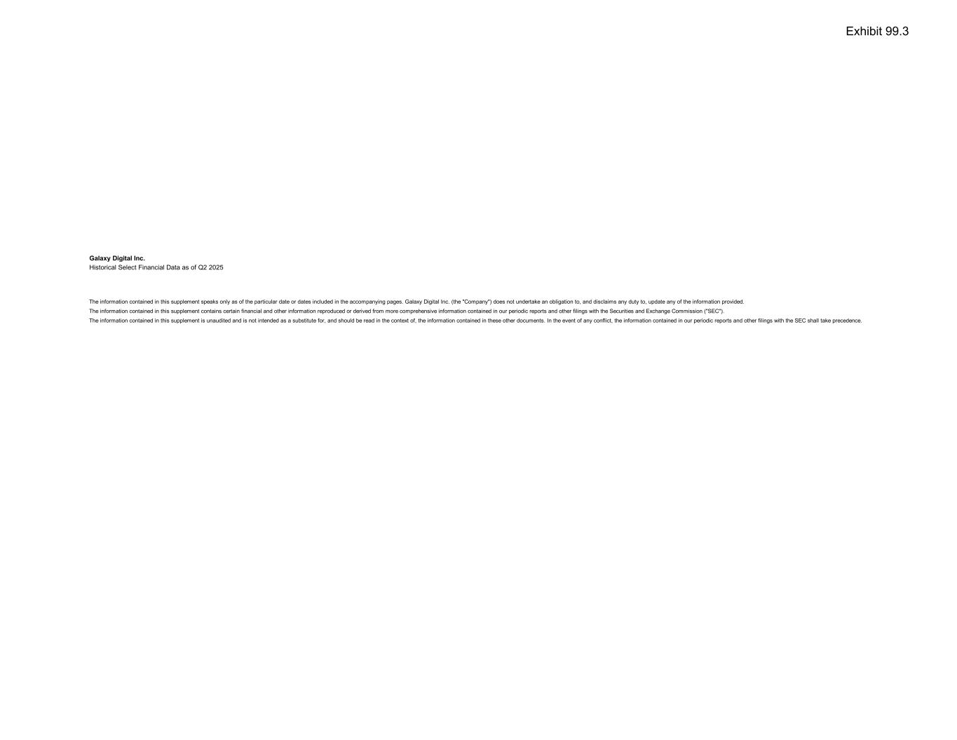 Galaxy Digital Inc. Historical Select Financial Data as of Q2 2025 The information contained in this supplement speaks only as of the particular date or dates included in the accompanying pages. Galaxy Digital Inc. (the "Company") does not undertake an obligation to, and disclaims any duty to, update any of the information provided. The information contained in this supplement contains certain financial and other information reproduced or derived from more comprehensive information contained in our periodic reports and other filings with the Securities and Exchange Commission ("SEC"). The information contained in this supplement is unaudited and is not intended as a substitute for, and should be read in the context of, the information contained in these other documents. In the event of any conflict, the information contained in our periodic reports and other filings with the SEC shall take precedence. Exhibit 99.3