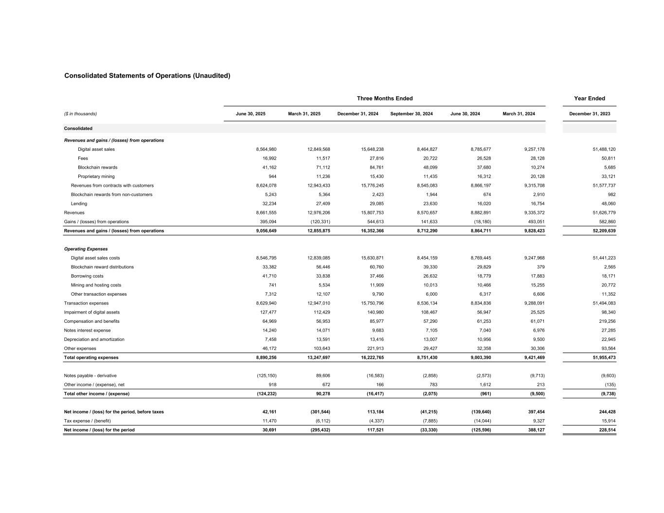 Consolidated Statements of Operations (Unaudited) Three Months Ended Year Ended ($ in thousands) June 30, 2025 March 31, 2025 December 31, 2024 September 30, 2024 June 30, 2024 March 31, 2024 December 31, 2023 Consolidated Revenues and gains / (losses) from operations Digital asset sales 8,564,980 12,849,568 15,648,238 8,464,827 8,785,677 9,257,178 51,488,120 Fees 16,992 11,517 27,816 20,722 26,528 28,128 50,811 Blockchain rewards 41,162 71,112 84,761 48,099 37,680 10,274 5,685 Proprietary mining 944 11,236 15,430 11,435 16,312 20,128 33,121 Revenues from contracts with customers 8,624,078 12,943,433 15,776,245 8,545,083 8,866,197 9,315,708 51,577,737 Blockchain rewards from non-customers 5,243 5,364 2,423 1,944 674 2,910 982 Lending 32,234 27,409 29,085 23,630 16,020 16,754 48,060 Revenues 8,661,555 12,976,206 15,807,753 8,570,657 8,882,891 9,335,372 51,626,779 Gains / (losses) from operations 395,094 (120,331) 544,613 141,633 (18,180) 493,051 582,860 Revenues and gains / (losses) from operations 9,056,649 12,855,875 16,352,366 8,712,290 8,864,711 9,828,423 52,209,639 Operating Expenses Digital asset sales costs 8,546,795 12,839,085 15,630,871 8,454,159 8,769,445 9,247,968 51,441,223 Blockchain reward distributions 33,382 56,446 60,760 39,330 29,829 379 2,565 Borrowing costs 41,710 33,838 37,466 26,632 18,779 17,883 18,171 Mining and hosting costs 741 5,534 11,909 10,013 10,466 15,255 20,772 Other transaction expenses 7,312 12,107 9,790 6,000 6,317 6,606 11,352 Transaction expenses 8,629,940 12,947,010 15,750,796 8,536,134 8,834,836 9,288,091 51,494,083 Impairment of digital assets 127,477 112,429 140,980 108,467 56,947 25,525 98,340 Compensation and benefits 64,969 56,953 85,977 57,290 61,253 61,071 219,256 Notes interest expense 14,240 14,071 9,683 7,105 7,040 6,976 27,285 Depreciation and amortization 7,458 13,591 13,416 13,007 10,956 9,500 22,945 Other expenses 46,172 103,643 221,913 29,427 32,358 30,306 93,564 Total operating expenses 8,890,256 13,247,697 16,222,765 8,751,430 9,003,390 9,421,469 51,955,473 Notes payable - derivative (125,150) 89,606 (16,583) (2,858) (2,573) (9,713) (9,603) Other income / (expense), net 918 672 166 783 1,612 213 (135) Total other income / (expense) (124,232) 90,278 (16,417) (2,075) (961) (9,500) (9,738) Net income / (loss) for the period, before taxes 42,161 (301,544) 113,184 (41,215) (139,640) 397,454 244,428 Tax expense / (benefit) 11,470 (6,112) (4,337) (7,885) (14,044) 9,327 15,914 Net income / (loss) for the period 30,691 (295,432) 117,521 (33,330) (125,596) 388,127 228,514