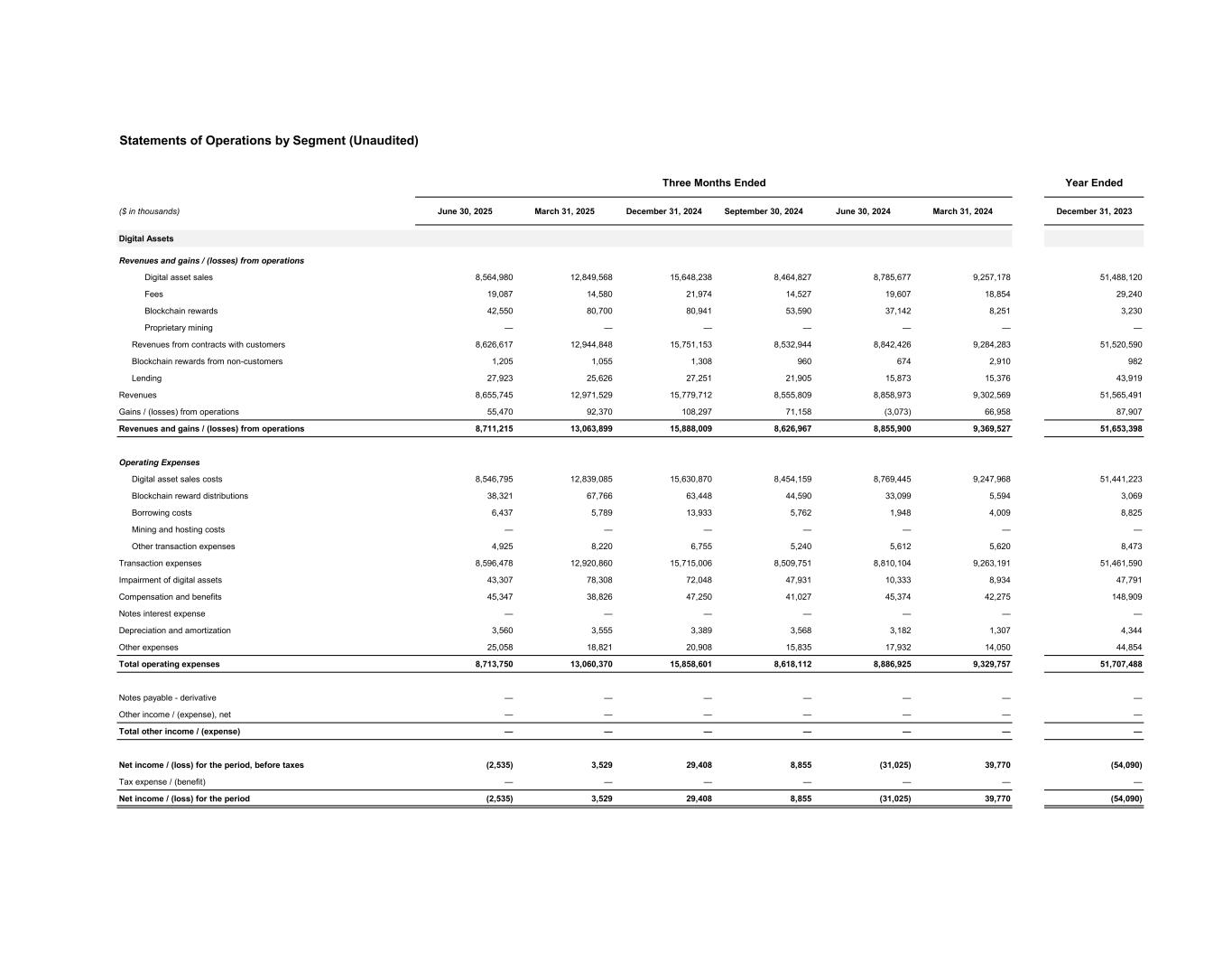 Statements of Operations by Segment (Unaudited) Three Months Ended Year Ended ($ in thousands) June 30, 2025 March 31, 2025 December 31, 2024 September 30, 2024 June 30, 2024 March 31, 2024 December 31, 2023 Digital Assets Revenues and gains / (losses) from operations Digital asset sales 8,564,980 12,849,568 15,648,238 8,464,827 8,785,677 9,257,178 51,488,120 Fees 19,087 14,580 21,974 14,527 19,607 18,854 29,240 Blockchain rewards 42,550 80,700 80,941 53,590 37,142 8,251 3,230 Proprietary mining — — — — — — — Revenues from contracts with customers 8,626,617 12,944,848 15,751,153 8,532,944 8,842,426 9,284,283 51,520,590 Blockchain rewards from non-customers 1,205 1,055 1,308 960 674 2,910 982 Lending 27,923 25,626 27,251 21,905 15,873 15,376 43,919 Revenues 8,655,745 12,971,529 15,779,712 8,555,809 8,858,973 9,302,569 51,565,491 Gains / (losses) from operations 55,470 92,370 108,297 71,158 (3,073) 66,958 87,907 Revenues and gains / (losses) from operations 8,711,215 13,063,899 15,888,009 8,626,967 8,855,900 9,369,527 51,653,398 Operating Expenses Digital asset sales costs 8,546,795 12,839,085 15,630,870 8,454,159 8,769,445 9,247,968 51,441,223 Blockchain reward distributions 38,321 67,766 63,448 44,590 33,099 5,594 3,069 Borrowing costs 6,437 5,789 13,933 5,762 1,948 4,009 8,825 Mining and hosting costs — — — — — — — Other transaction expenses 4,925 8,220 6,755 5,240 5,612 5,620 8,473 Transaction expenses 8,596,478 12,920,860 15,715,006 8,509,751 8,810,104 9,263,191 51,461,590 Impairment of digital assets 43,307 78,308 72,048 47,931 10,333 8,934 47,791 Compensation and benefits 45,347 38,826 47,250 41,027 45,374 42,275 148,909 Notes interest expense — — — — — — — Depreciation and amortization 3,560 3,555 3,389 3,568 3,182 1,307 4,344 Other expenses 25,058 18,821 20,908 15,835 17,932 14,050 44,854 Total operating expenses 8,713,750 13,060,370 15,858,601 8,618,112 8,886,925 9,329,757 51,707,488 Notes payable - derivative — — — — — — — Other income / (expense), net — — — — — — — Total other income / (expense) — — — — — — — Net income / (loss) for the period, before taxes (2,535) 3,529 29,408 8,855 (31,025) 39,770 (54,090) Tax expense / (benefit) — — — — — — — Net income / (loss) for the period (2,535) 3,529 29,408 8,855 (31,025) 39,770 (54,090)