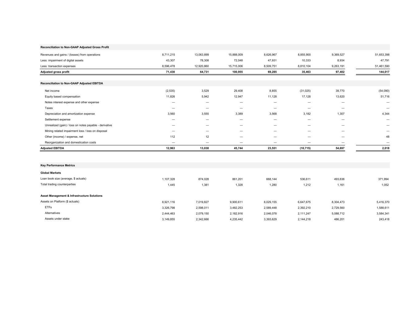 Reconciliation to Non-GAAP Adjusted Gross Profit Revenues and gains / (losses) from operations 8,711,215 13,063,899 15,888,009 8,626,967 8,855,900 9,369,527 51,653,398 Less: impairment of digital assets 43,307 78,308 72,048 47,931 10,333 8,934 47,791 Less: transaction expenses 8,596,478 12,920,860 15,715,006 8,509,751 8,810,104 9,263,191 51,461,590 Adjusted gross profit 71,430 64,731 100,955 69,285 35,463 97,402 144,017 Reconciliation to Non-GAAP Adjusted EBITDA Net income (2,535) 3,529 29,408 8,855 (31,025) 39,770 (54,090) Equity based compensation 11,826 5,942 12,947 11,128 17,128 13,620 51,716 Notes interest expense and other expense — — — — — — — Taxes — — — — — — — Depreciation and amortization expense 3,560 3,555 3,389 3,568 3,182 1,307 4,344 Settlement expense — — — — — — — Unrealized (gain) / loss on notes payable - derivative — — — — — — — Mining related impairment loss / loss on disposal — — — — — — — Other (income) / expense, net 112 12 — — — — 48 Reorganization and domestication costs — — — — — — — Adjusted EBITDA 12,963 13,038 45,744 23,551 (10,715) 54,697 2,018 Key Performance Metrics Global Markets Loan book size (average, $ actuals) 1,107,328 874,028 861,201 668,144 536,611 493,636 371,994 Total trading counterparties 1,445 1,381 1,328 1,280 1,212 1,161 1,052 Asset Management & Infrastructure Solutions Assets on Platform ($ actuals) 8,921,116 7,019,827 9,900,611 8,029,155 6,647,675 8,304,473 5,416,370 ETFs 3,326,798 2,598,011 3,482,253 2,589,448 2,392,210 2,729,560 1,588,611 Alternatives 2,444,463 2,079,150 2,182,916 2,046,078 2,111,247 5,088,712 3,584,341 Assets under stake 3,149,855 2,342,666 4,235,442 3,393,629 2,144,218 486,201 243,418