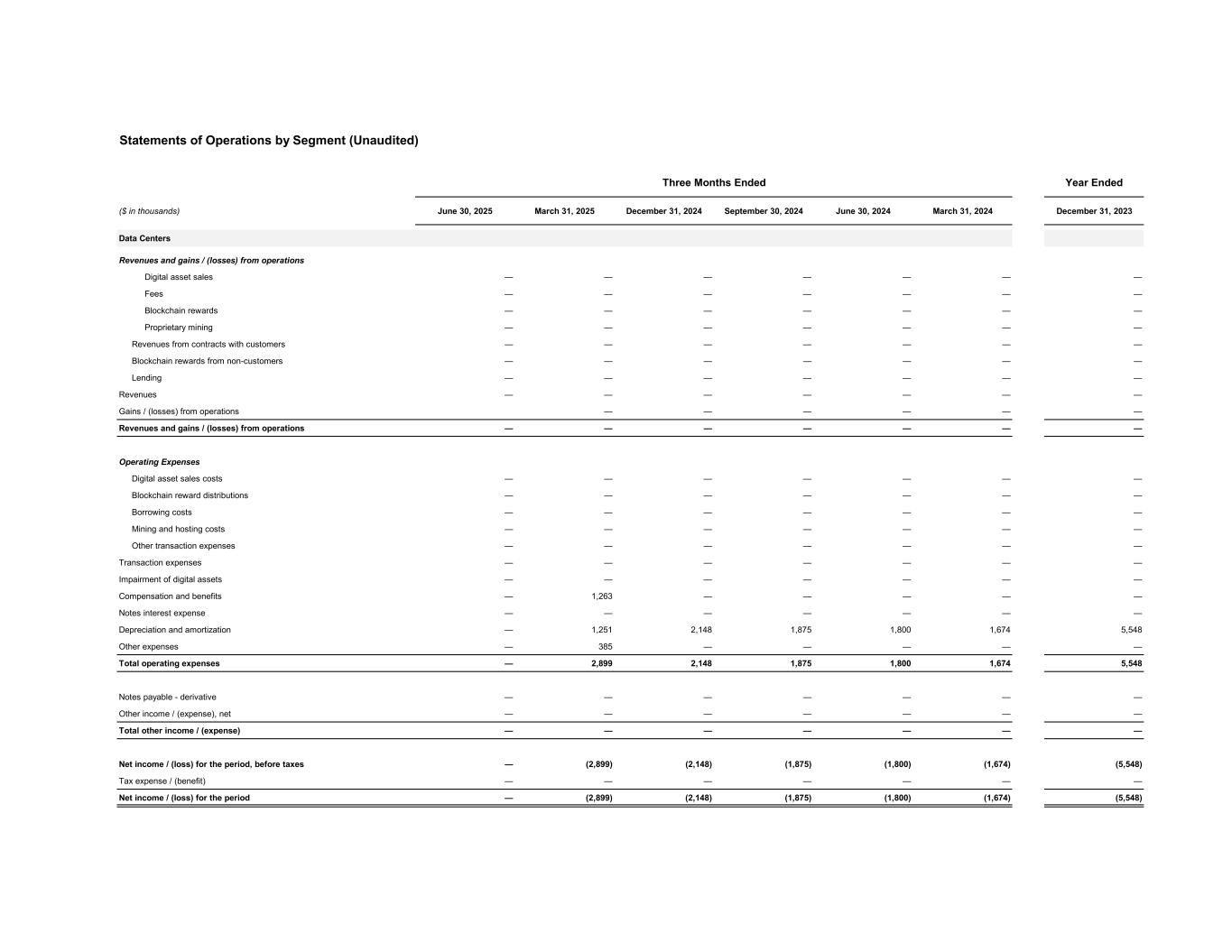 Statements of Operations by Segment (Unaudited) Three Months Ended Year Ended ($ in thousands) June 30, 2025 March 31, 2025 December 31, 2024 September 30, 2024 June 30, 2024 March 31, 2024 December 31, 2023 Data Centers Revenues and gains / (losses) from operations Digital asset sales — — — — — — — Fees — — — — — — — Blockchain rewards — — — — — — — Proprietary mining — — — — — — — Revenues from contracts with customers — — — — — — — Blockchain rewards from non-customers — — — — — — — Lending — — — — — — — Revenues — — — — — — — Gains / (losses) from operations — — — — — — Revenues and gains / (losses) from operations — — — — — — — Operating Expenses Digital asset sales costs — — — — — — — Blockchain reward distributions — — — — — — — Borrowing costs — — — — — — — Mining and hosting costs — — — — — — — Other transaction expenses — — — — — — — Transaction expenses — — — — — — — Impairment of digital assets — — — — — — — Compensation and benefits — 1,263 — — — — — Notes interest expense — — — — — — — Depreciation and amortization — 1,251 2,148 1,875 1,800 1,674 5,548 Other expenses — 385 — — — — — Total operating expenses — 2,899 2,148 1,875 1,800 1,674 5,548 Notes payable - derivative — — — — — — — Other income / (expense), net — — — — — — — Total other income / (expense) — — — — — — — Net income / (loss) for the period, before taxes — (2,899) (2,148) (1,875) (1,800) (1,674) (5,548) Tax expense / (benefit) — — — — — — — Net income / (loss) for the period — (2,899) (2,148) (1,875) (1,800) (1,674) (5,548)