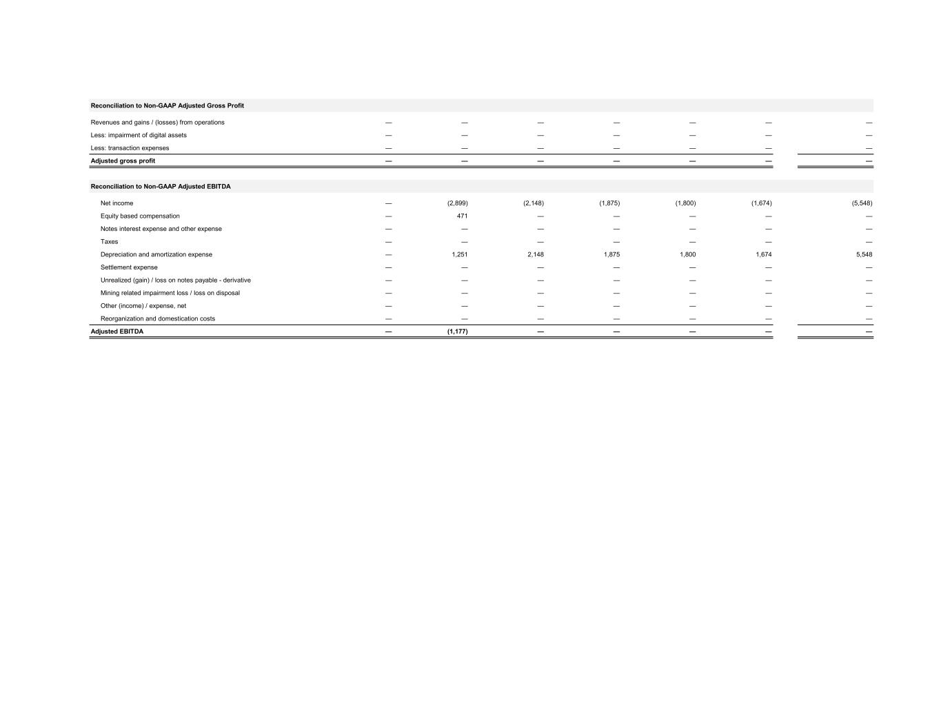 Reconciliation to Non-GAAP Adjusted Gross Profit Revenues and gains / (losses) from operations — — — — — — — Less: impairment of digital assets — — — — — — — Less: transaction expenses — — — — — — — Adjusted gross profit — — — — — — — Reconciliation to Non-GAAP Adjusted EBITDA Net income — (2,899) (2,148) (1,875) (1,800) (1,674) (5,548) Equity based compensation — 471 — — — — — Notes interest expense and other expense — — — — — — — Taxes — — — — — — — Depreciation and amortization expense — 1,251 2,148 1,875 1,800 1,674 5,548 Settlement expense — — — — — — — Unrealized (gain) / loss on notes payable - derivative — — — — — — — Mining related impairment loss / loss on disposal — — — — — — — Other (income) / expense, net — — — — — — — Reorganization and domestication costs — — — — — — — Adjusted EBITDA — (1,177) — — — — —