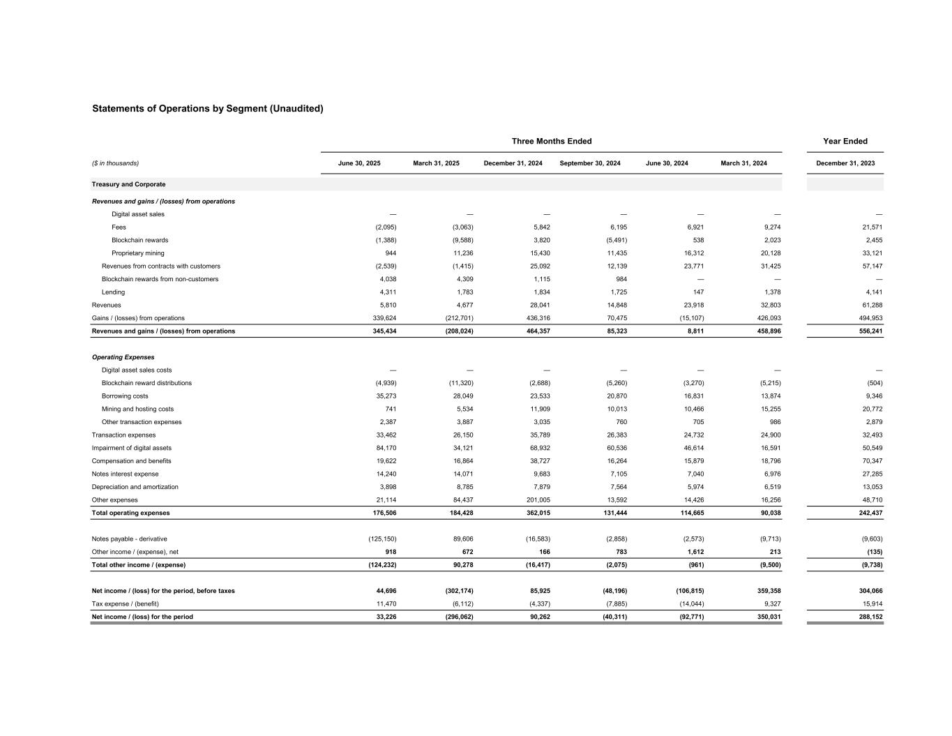 Statements of Operations by Segment (Unaudited) Three Months Ended Year Ended ($ in thousands) June 30, 2025 March 31, 2025 December 31, 2024 September 30, 2024 June 30, 2024 March 31, 2024 December 31, 2023 Treasury and Corporate Revenues and gains / (losses) from operations Digital asset sales — — — — — — — Fees (2,095) (3,063) 5,842 6,195 6,921 9,274 21,571 Blockchain rewards (1,388) (9,588) 3,820 (5,491) 538 2,023 2,455 Proprietary mining 944 11,236 15,430 11,435 16,312 20,128 33,121 Revenues from contracts with customers (2,539) (1,415) 25,092 12,139 23,771 31,425 57,147 Blockchain rewards from non-customers 4,038 4,309 1,115 984 — — — Lending 4,311 1,783 1,834 1,725 147 1,378 4,141 Revenues 5,810 4,677 28,041 14,848 23,918 32,803 61,288 Gains / (losses) from operations 339,624 (212,701) 436,316 70,475 (15,107) 426,093 494,953 Revenues and gains / (losses) from operations 345,434 (208,024) 464,357 85,323 8,811 458,896 556,241 Operating Expenses Digital asset sales costs — — — — — — — Blockchain reward distributions (4,939) (11,320) (2,688) (5,260) (3,270) (5,215) (504) Borrowing costs 35,273 28,049 23,533 20,870 16,831 13,874 9,346 Mining and hosting costs 741 5,534 11,909 10,013 10,466 15,255 20,772 Other transaction expenses 2,387 3,887 3,035 760 705 986 2,879 Transaction expenses 33,462 26,150 35,789 26,383 24,732 24,900 32,493 Impairment of digital assets 84,170 34,121 68,932 60,536 46,614 16,591 50,549 Compensation and benefits 19,622 16,864 38,727 16,264 15,879 18,796 70,347 Notes interest expense 14,240 14,071 9,683 7,105 7,040 6,976 27,285 Depreciation and amortization 3,898 8,785 7,879 7,564 5,974 6,519 13,053 Other expenses 21,114 84,437 201,005 13,592 14,426 16,256 48,710 Total operating expenses 176,506 184,428 362,015 131,444 114,665 90,038 242,437 Notes payable - derivative (125,150) 89,606 (16,583) (2,858) (2,573) (9,713) (9,603) Other income / (expense), net 918 672 166 783 1,612 213 (135) Total other income / (expense) (124,232) 90,278 (16,417) (2,075) (961) (9,500) (9,738) Net income / (loss) for the period, before taxes 44,696 (302,174) 85,925 (48,196) (106,815) 359,358 304,066 Tax expense / (benefit) 11,470 (6,112) (4,337) (7,885) (14,044) 9,327 15,914 Net income / (loss) for the period 33,226 (296,062) 90,262 (40,311) (92,771) 350,031 288,152