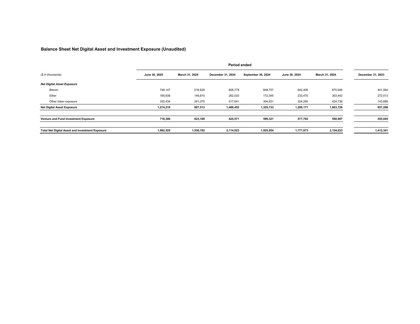 Balance Sheet Net Digital Asset and Investment Exposure (Unaudited) Period ended ($ in thousands) June 30, 2025 March 31, 2025 December 31, 2024 September 30, 2024 June 30, 2024 March 31, 2024 December 31, 2023 Net Digital Asset Exposure Bitcoin 748,147 516,628 808,778 848,757 642,406 875,546 441,594 Ether 195,638 149,810 262,033 172,345 233,470 303,442 272,013 Other token exposure 330,434 241,075 417,641 304,631 324,295 424,738 143,689 Net Digital Asset Exposure 1,274,219 907,513 1,488,452 1,325,733 1,200,171 1,603,726 857,296 Venture and Fund Investment Exposure 718,306 623,189 625,571 599,321 577,702 550,907 555,045 Total Net Digital Asset and Investment Exposure 1,992,525 1,530,702 2,114,023 1,925,054 1,777,873 2,154,633 1,412,341