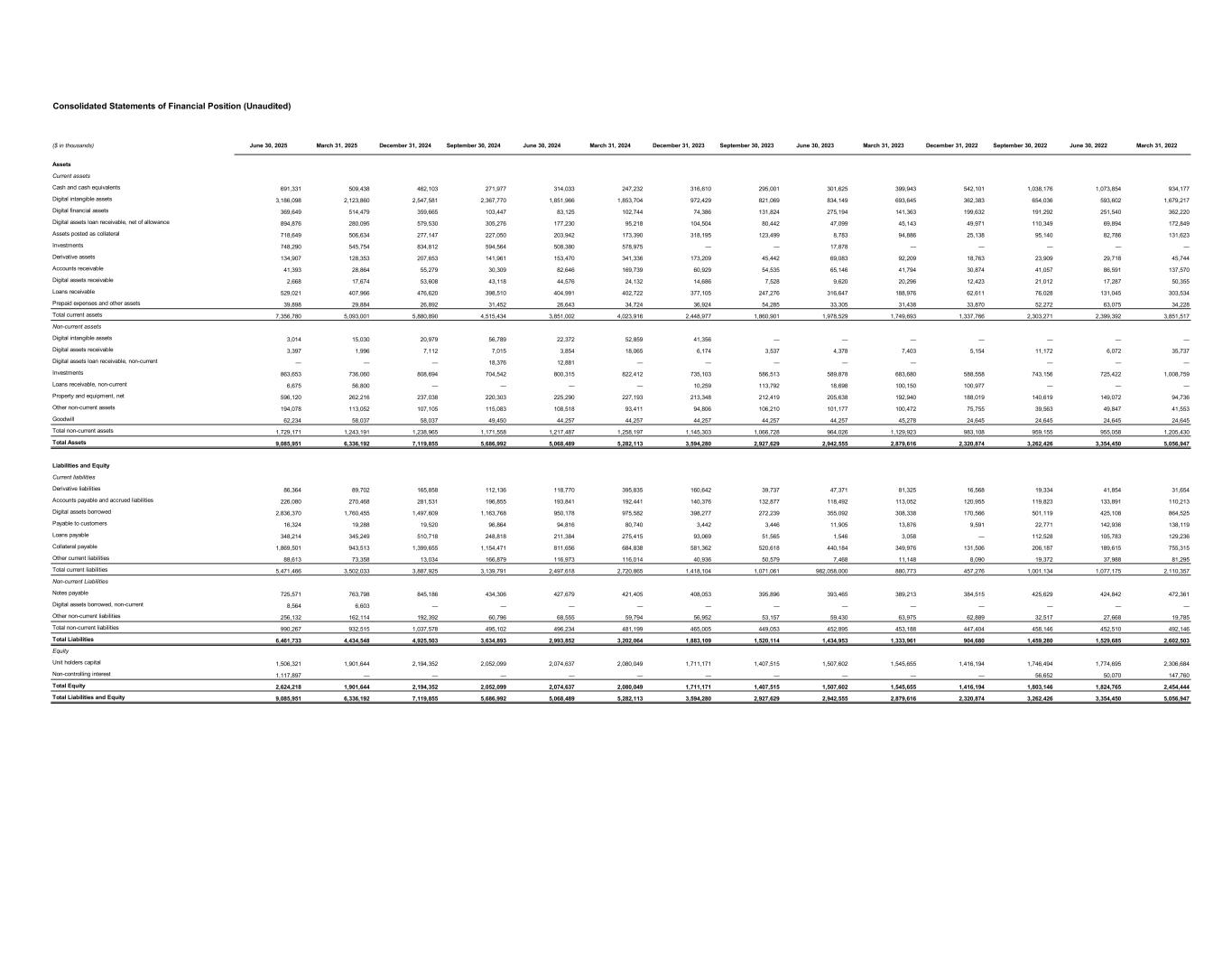 Consolidated Statements of Financial Position (Unaudited) ($ in thousands) June 30, 2025 March 31, 2025 December 31, 2024 September 30, 2024 June 30, 2024 March 31, 2024 December 31, 2023 September 30, 2023 June 30, 2023 March 31, 2023 December 31, 2022 September 30, 2022 June 30, 2022 March 31, 2022 Assets Current assets Cash and cash equivalents 691,331 509,438 462,103 271,977 314,033 247,232 316,610 295,001 301,625 399,943 542,101 1,038,176 1,073,854 934,177 Digital intangible assets 3,186,098 2,123,860 2,547,581 2,367,770 1,851,966 1,853,704 972,429 821,069 834,149 693,645 362,383 654,036 593,602 1,679,217 Digital financial assets 369,649 514,479 359,665 103,447 83,125 102,744 74,386 131,824 275,194 141,363 199,632 191,292 251,540 362,220 Digital assets loan receivable, net of allowance 894,876 280,095 579,530 305,276 177,230 95,218 104,504 80,442 47,099 45,143 49,971 110,349 69,894 172,849 Assets posted as collateral 718,649 506,634 277,147 227,050 203,942 173,390 318,195 123,499 8,783 94,886 25,138 95,140 82,786 131,623 Investments 748,290 545,754 834,812 594,564 508,380 578,975 — — 17,878 — — — — — Derivative assets 134,907 128,353 207,653 141,961 153,470 341,336 173,209 45,442 69,083 92,209 18,763 23,909 29,718 45,744 Accounts receivable 41,393 28,864 55,279 30,309 82,646 169,739 60,929 54,535 65,146 41,794 30,874 41,057 86,591 137,570 Digital assets receivable 2,668 17,674 53,608 43,118 44,576 24,132 14,686 7,528 9,620 20,296 12,423 21,012 17,287 50,355 Loans receivable 529,021 407,966 476,620 398,510 404,991 402,722 377,105 247,276 316,647 188,976 62,611 76,028 131,045 303,534 Prepaid expenses and other assets 39,898 29,884 26,892 31,452 26,643 34,724 36,924 54,285 33,305 31,438 33,870 52,272 63,075 34,228 Total current assets 7,356,780 5,093,001 5,880,890 4,515,434 3,851,002 4,023,916 2,448,977 1,860,901 1,978,529 1,749,693 1,337,766 2,303,271 2,399,392 3,851,517 Non-current assets Digital intangible assets 3,014 15,030 20,979 56,789 22,372 52,859 41,356 — — — — — — — Digital assets receivable 3,397 1,996 7,112 7,015 3,854 18,065 6,174 3,537 4,378 7,403 5,154 11,172 6,072 35,737 Digital assets loan receivable, non-current — — — 18,376 12,881 — — — — — — — — Investments 863,653 736,060 808,694 704,542 800,315 822,412 735,103 586,513 589,878 683,680 588,558 743,156 725,422 1,008,759 Loans receivable, non-current 6,675 56,800 — — — — 10,259 113,792 18,698 100,150 100,977 — — — Property and equipment, net 596,120 262,216 237,038 220,303 225,290 227,193 213,348 212,419 205,638 192,940 188,019 140,619 149,072 94,736 Other non-current assets 194,078 113,052 107,105 115,083 108,518 93,411 94,806 106,210 101,177 100,472 75,755 39,563 49,847 41,553 Goodwill 62,234 58,037 58,037 49,450 44,257 44,257 44,257 44,257 44,257 45,278 24,645 24,645 24,645 24,645 Total non-current assets 1,729,171 1,243,191 1,238,965 1,171,558 1,217,487 1,258,197 1,145,303 1,066,728 964,026 1,129,923 983,108 959,155 955,058 1,205,430 Total Assets 9,085,951 6,336,192 7,119,855 5,686,992 5,068,489 5,282,113 3,594,280 2,927,629 2,942,555 2,879,616 2,320,874 3,262,426 3,354,450 5,056,947 Liabilities and Equity Current liabilities Derivative liabilities 86,364 89,702 165,858 112,136 118,770 395,835 160,642 39,737 47,371 81,325 16,568 19,334 41,854 31,654 Accounts payable and accrued liabilities 226,080 270,468 281,531 196,855 193,841 192,441 140,376 132,877 118,492 113,052 120,955 119,823 133,891 110,213 Digital assets borrowed 2,836,370 1,760,455 1,497,609 1,163,768 950,178 975,582 398,277 272,239 355,092 308,338 170,566 501,119 425,108 864,525 Payable to customers 16,324 19,288 19,520 96,864 94,816 80,740 3,442 3,446 11,905 13,876 9,591 22,771 142,936 138,119 Loans payable 348,214 345,249 510,718 248,818 211,384 275,415 93,069 51,565 1,546 3,058 — 112,528 105,783 129,236 Collateral payable 1,869,501 943,513 1,399,655 1,154,471 811,656 684,838 581,362 520,618 440,184 349,976 131,506 206,187 189,615 755,315 Other current liabilities 88,613 73,358 13,034 166,879 116,973 116,014 40,936 50,579 7,468 11,148 8,090 19,372 37,988 81,295 Total current liabilities 5,471,466 3,502,033 3,887,925 3,139,791 2,497,618 2,720,865 1,418,104 1,071,061 982,058,000 880,773 457,276 1,001,134 1,077,175 2,110,357 Non-current Liabilities Notes payable 725,571 763,798 845,186 434,306 427,679 421,405 408,053 395,896 393,465 389,213 384,515 425,629 424,842 472,361 Digital assets borrowed, non-current 8,564 6,603 — — — — — — — — — — — — Other non-current liabilities 256,132 162,114 192,392 60,796 68,555 59,794 56,952 53,157 59,430 63,975 62,889 32,517 27,668 19,785 Total non-current liabilities 990,267 932,515 1,037,578 495,102 496,234 481,199 465,005 449,053 452,895 453,188 447,404 458,146 452,510 492,146 Total Liabilities 6,461,733 4,434,548 4,925,503 3,634,893 2,993,852 3,202,064 1,883,109 1,520,114 1,434,953 1,333,961 904,680 1,459,280 1,529,685 2,602,503 Equity Unit holders capital 1,506,321 1,901,644 2,194,352 2,052,099 2,074,637 2,080,049 1,711,171 1,407,515 1,507,602 1,545,655 1,416,194 1,746,494 1,774,695 2,306,684 Non-controlling interest 1,117,897 — — — — — — — — — — 56,652 50,070 147,760 Total Equity 2,624,218 1,901,644 2,194,352 2,052,099 2,074,637 2,080,049 1,711,171 1,407,515 1,507,602 1,545,655 1,416,194 1,803,146 1,824,765 2,454,444 Total Liabilities and Equity 9,085,951 6,336,192 7,119,855 5,686,992 5,068,489 5,282,113 3,594,280 2,927,629 2,942,555 2,879,616 2,320,874 3,262,426 3,354,450 5,056,947