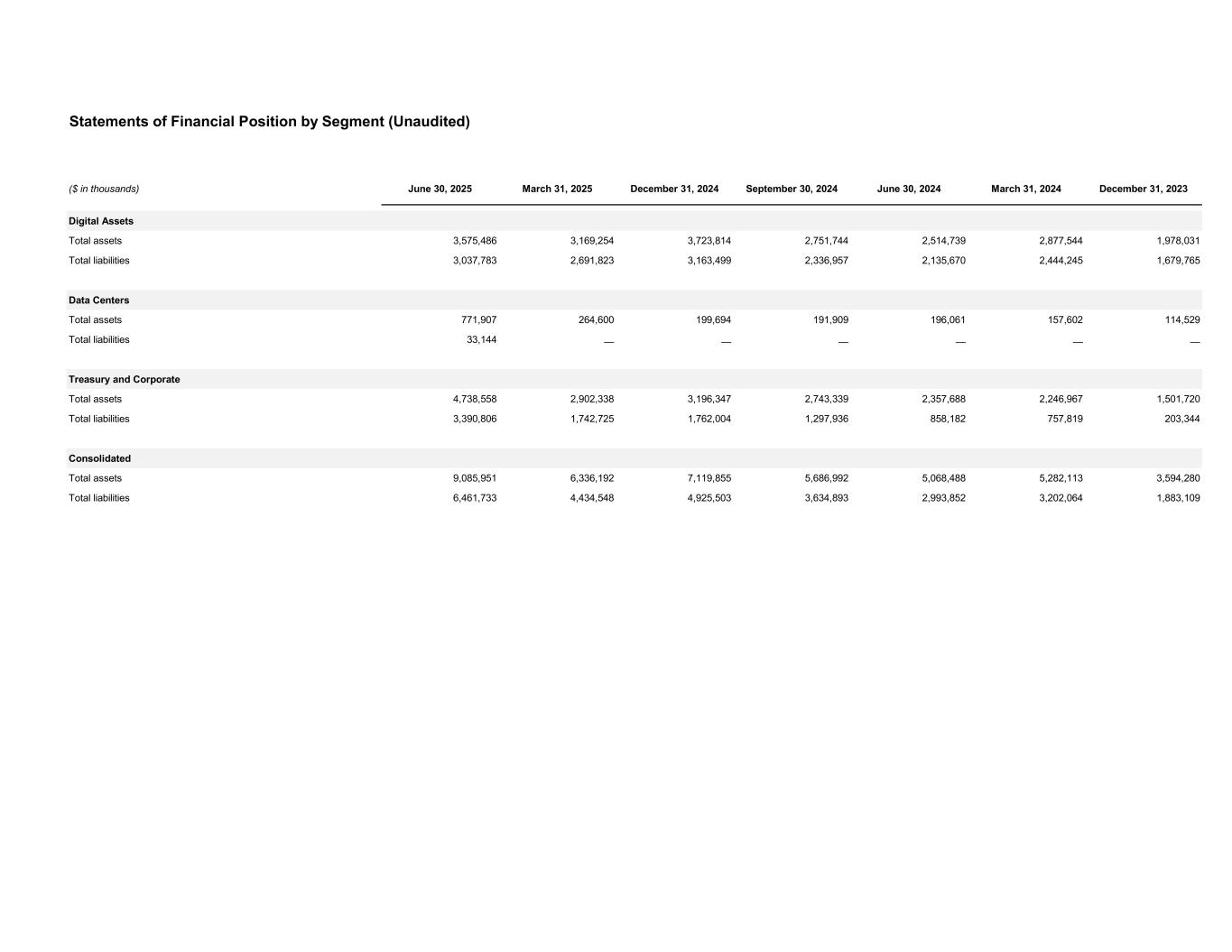 Statements of Financial Position by Segment (Unaudited) ($ in thousands) June 30, 2025 March 31, 2025 December 31, 2024 September 30, 2024 June 30, 2024 March 31, 2024 December 31, 2023 Digital Assets Total assets 3,575,486 3,169,254 3,723,814 2,751,744 2,514,739 2,877,544 1,978,031 Total liabilities 3,037,783 2,691,823 3,163,499 2,336,957 2,135,670 2,444,245 1,679,765 Data Centers Total assets 771,907 264,600 199,694 191,909 196,061 157,602 114,529 Total liabilities 33,144 — — — — — — Treasury and Corporate Total assets 4,738,558 2,902,338 3,196,347 2,743,339 2,357,688 2,246,967 1,501,720 Total liabilities 3,390,806 1,742,725 1,762,004 1,297,936 858,182 757,819 203,344 Consolidated Total assets 9,085,951 6,336,192 7,119,855 5,686,992 5,068,488 5,282,113 3,594,280 Total liabilities 6,461,733 4,434,548 4,925,503 3,634,893 2,993,852 3,202,064 1,883,109