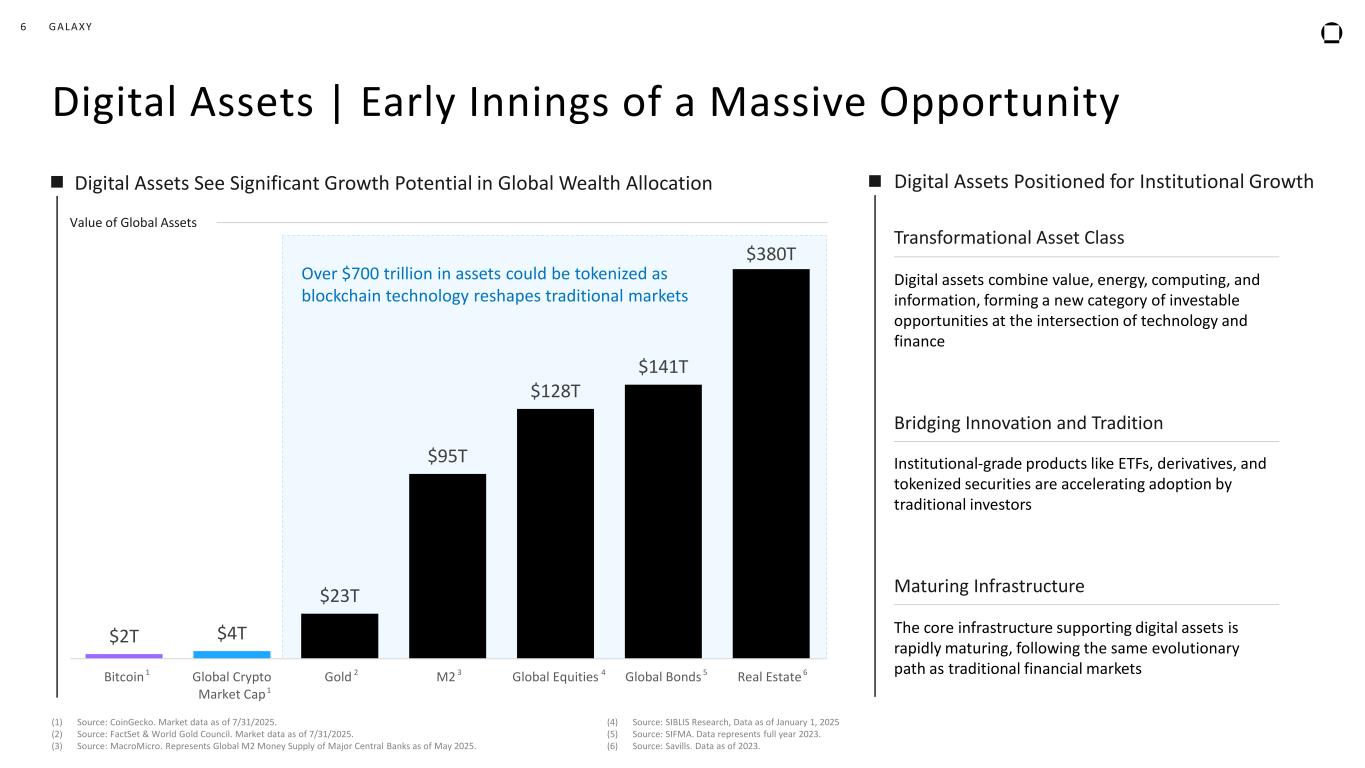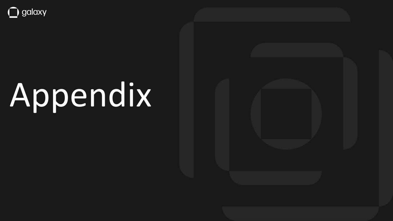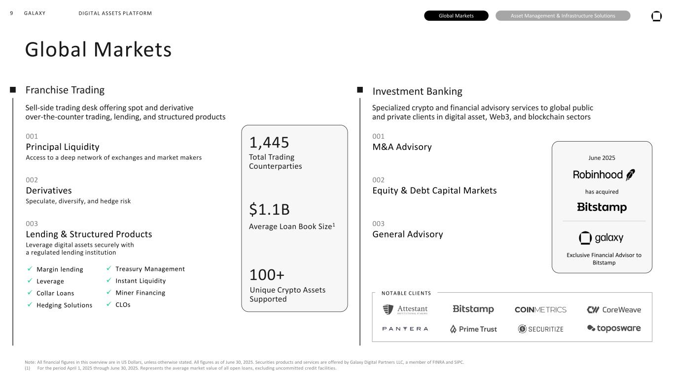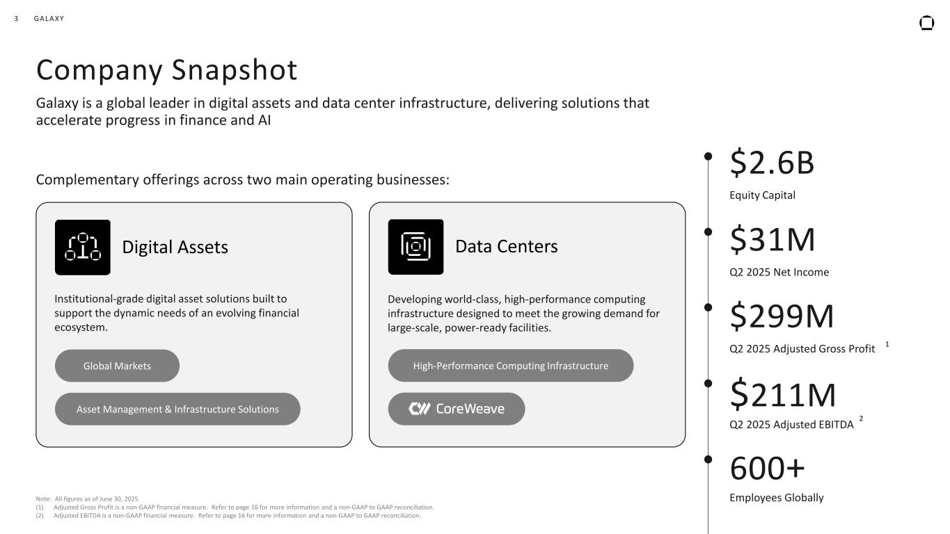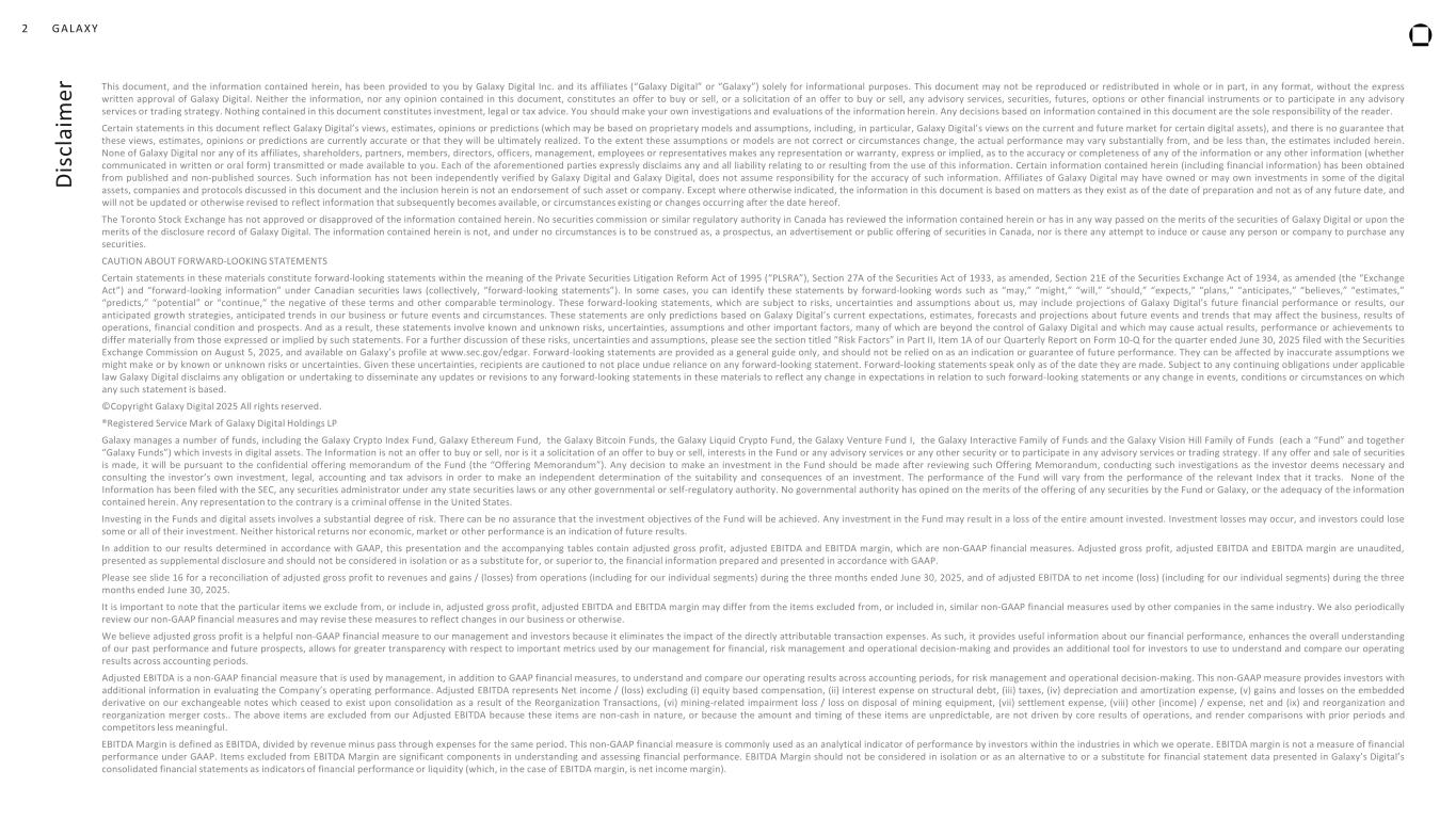 2 GALAXY D is cl ai m er This document, and the information contained herein, has been provided to you by Galaxy Digital Inc. and its affiliates (“Galaxy Digital” or “Galaxy”) solely for informational purposes. This document may not be reproduced or redistributed in whole or in part, in any format, without the express written approval of Galaxy Digital. Neither the information, nor any opinion contained in this document, constitutes an offer to buy or sell, or a solicitation of an offer to buy or sell, any advisory services, securities, futures, options or other financial instruments or to participate in any advisory services or trading strategy. Nothing contained in this document constitutes investment, legal or tax advice. You should make your own investigations and evaluations of the information herein. Any decisions based on information contained in this document are the sole responsibility of the reader. Certain statements in this document reflect Galaxy Digital’s views, estimates, opinions or predictions (which may be based on proprietary models and assumptions, including, in particular, Galaxy Digital’s views on the current and future market for certain digital assets), and there is no guarantee that these views, estimates, opinions or predictions are currently accurate or that they will be ultimately realized. To the extent these assumptions or models are not correct or circumstances change, the actual performance may vary substantially from, and be less than, the estimates included herein. None of Galaxy Digital nor any of its affiliates, shareholders, partners, members, directors, officers, management, employees or representatives makes any representation or warranty, express or implied, as to the accuracy or completeness of any of the information or any other information (whether communicated in written or oral form) transmitted or made available to you. Each of the aforementioned parties expressly disclaims any and all liability relating to or resulting from the use of this information. Certain information contained herein (including financial information) has been obtained from published and non-published sources. Such information has not been independently verified by Galaxy Digital and Galaxy Digital, does not assume responsibility for the accuracy of such information. Affiliates of Galaxy Digital may have owned or may own investments in some of the digital assets, companies and protocols discussed in this document and the inclusion herein is not an endorsement of such asset or company. Except where otherwise indicated, the information in this document is based on matters as they exist as of the date of preparation and not as of any future date, and will not be updated or otherwise revised to reflect information that subsequently becomes available, or circumstances existing or changes occurring after the date hereof. The Toronto Stock Exchange has not approved or disapproved of the information contained herein. No securities commission or similar regulatory authority in Canada has reviewed the information contained herein or has in any way passed on the merits of the securities of Galaxy Digital or upon the merits of the disclosure record of Galaxy Digital. The information contained herein is not, and under no circumstances is to be construed as, a prospectus, an advertisement or public offering of securities in Canada, nor is there any attempt to induce or cause any person or company to purchase any securities. CAUTION ABOUT FORWARD-LOOKING STATEMENTS Certain statements in these materials constitute forward-looking statements within the meaning of the Private Securities Litigation Reform Act of 1995 (“PLSRA”), Section 27A of the Securities Act of 1933, as amended, Section 21E of the Securities Exchange Act of 1934, as amended (the “Exchange Act”) and “forward-looking information” under Canadian securities laws (collectively, “forward-looking statements”). In some cases, you can identify these statements by forward-looking words such as “may,” “might,” “will,” “should,” “expects,” “plans,” “anticipates,” “believes,” “estimates,” “predicts,” “potential” or “continue,” the negative of these terms and other comparable terminology. These forward-looking statements, which are subject to risks, uncertainties and assumptions about us, may include projections of Galaxy Digital’s future financial performance or results, our anticipated growth strategies, anticipated trends in our business or future events and circumstances. These statements are only predictions based on Galaxy Digital’s current expectations, estimates, forecasts and projections about future events and trends that may affect the business, results of operations, financial condition and prospects. And as a result, these statements involve known and unknown risks, uncertainties, assumptions and other important factors, many of which are beyond the control of Galaxy Digital and which may cause actual results, performance or achievements to differ materially from those expressed or implied by such statements. For a further discussion of these risks, uncertainties and assumptions, please see the section titled “Risk Factors” in Part II, Item 1A of our Quarterly Report on Form 10-Q for the quarter ended June 30, 2025 filed with the Securities Exchange Commission on August 5, 2025, and available on Galaxy’s profile at www.sec.gov/edgar. Forward-looking statements are provided as a general guide only, and should not be relied on as an indication or guarantee of future performance. They can be affected by inaccurate assumptions we might make or by known or unknown risks or uncertainties. Given these uncertainties, recipients are cautioned to not place undue reliance on any forward-looking statement. Forward-looking statements speak only as of the date they are made. Subject to any continuing obligations under applicable law Galaxy Digital di