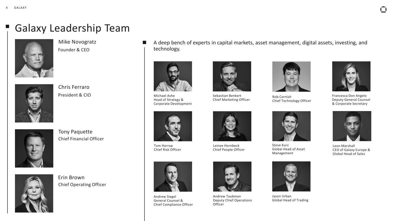 4 GALAXY Galaxy Leadership Team Erin Brown Chief Operating Officer Andrew Taubman Deputy Chief Operations Officer Andrew Siegel General Counsel & Chief Compliance Officer Jason Urban Global Head of Trading Chris Ferraro President & CIO Mike Novogratz Founder & CEO Tony Paquette Chief Financial Officer Michael Ashe Head of Strategy & Corporate Development Sebastian Benkert Chief Marketing Officer Rob Cornish Chief Technology Officer Francesca Don Angelo Deputy General Counsel & Corporate Secretary Steve Kurz Global Head of Asset Management Tom Harrop Chief Risk Officer Leinee Hornbeck Chief People Officer Leon Marshall CEO of Galaxy Europe & Global Head of Sales A deep bench of experts in capital markets, asset management, digital assets, investing, and technology.