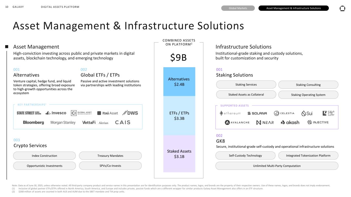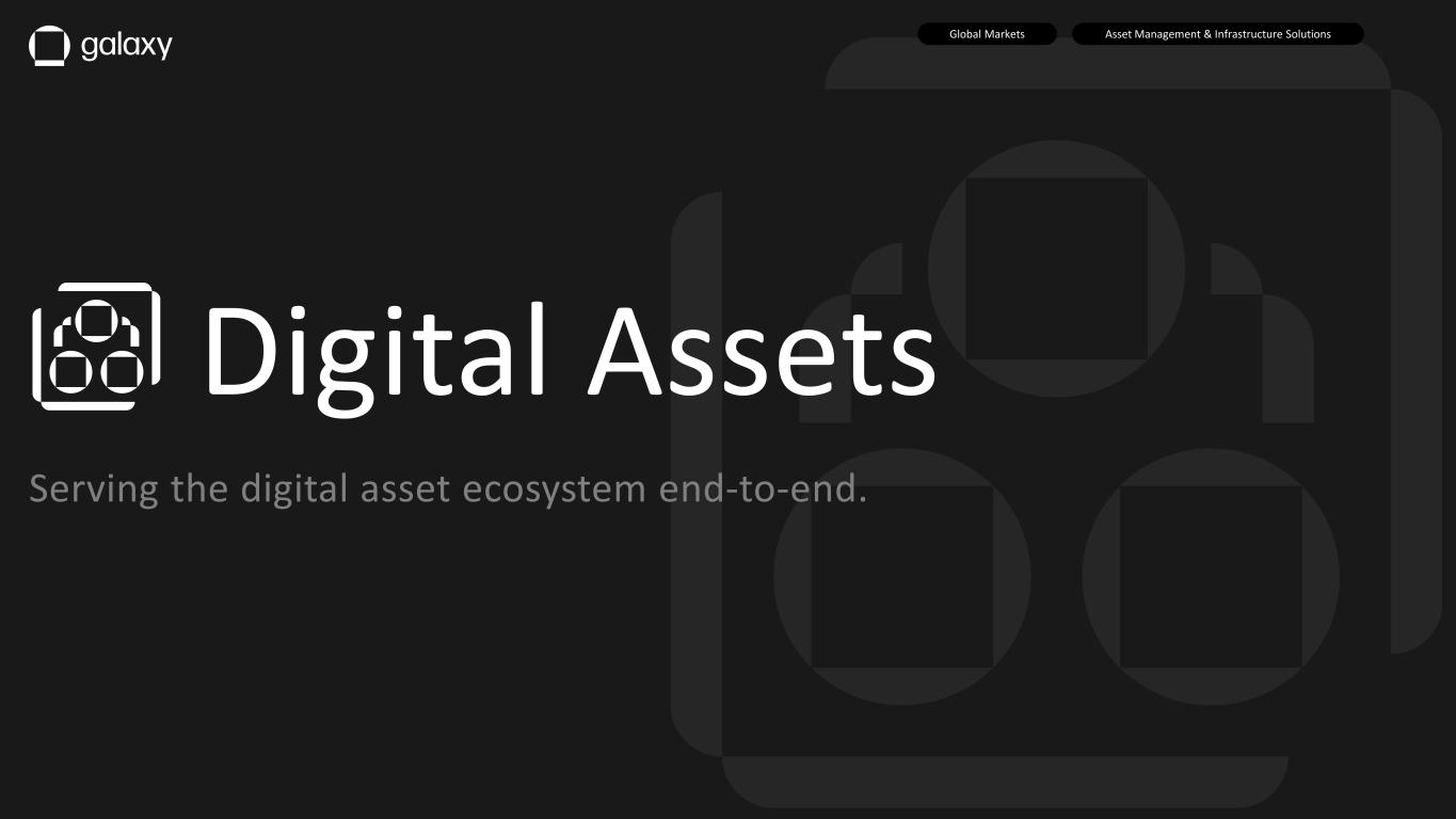 8 GALAXY Digital Assets Serving the digital asset ecosystem end-to-end. Global Markets Asset Management & Infrastructure Solutions
