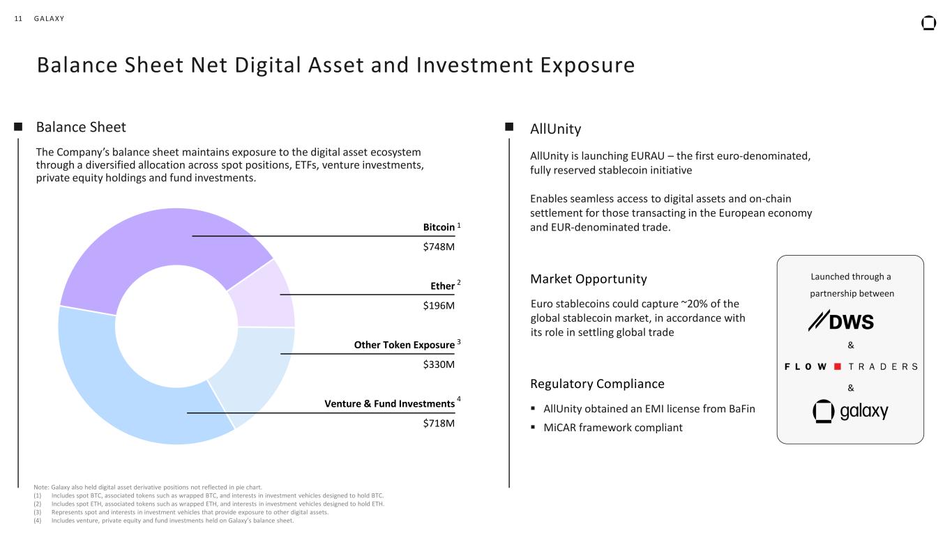 10 GALAXY Asset Management & Infrastructure Solutions Infrastructure Solutions Asset Management DIGITAL ASSETS PLATFORM High-conviction investing across public and private markets in digital assets, blockchain technology, and emerging technology Institutional-grade staking and custody solutions, built for customization and security Staked Assets $3.1B ETFs / ETPs $3.3B Alternatives $2.4B $9B Global Markets Asset Management & Infrastructure Solutions Self-Custody Technology Integrated Tokenization Platform Unlimited Multi-Party Computation Staking Operating System Staking Consulting Staked Assets as Collateral Staking Services 001 Alternatives Venture capital, hedge fund, and liquid token strategies, offering broad exposure to high-growth opportunities across the ecosystem 002 Global ETFs / ETPs Passive and active investment solutions via partnerships with leading institutions 003 Crypto Services Index Construction SPVs/Co-Invests Treasury Mandates Opportunistic Investments 001 Staking Solutions 002 GK8 Secure, institutional-grade self-custody and operational infrastructure solutions KEY PARTNERSHIPS1 SUPPORTED ASSETS COMBINED ASSETS ON PLATFORM2 Note: Data as of June 30, 2025, unless otherwise noted. All third-party company product and service names in this presentation are for identification purposes only. The product names, logos, and brands are the property of their respective owners. Use of these names, logos, and brands does not imply endorsement. (1) Inclusive of global partner ETFs/ETPs offered in North America, South America, and Europe and includes private, passive funds which are a different wrapper for similar products Galaxy Asset Management also offers in an ETF structure. (2) $268 million of assets are counted in both AUS and AUM due to the SBET mandate and TIA prop units.