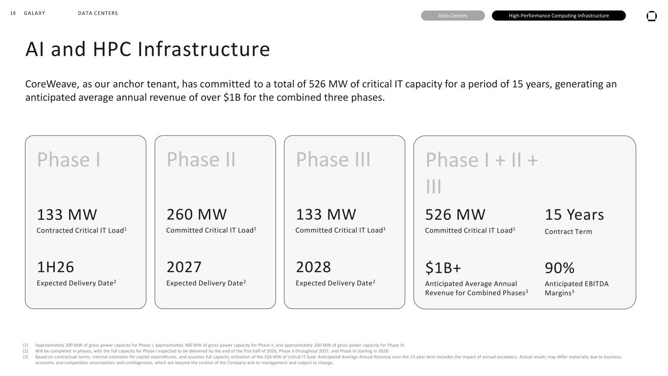 14 GALAXY DATA CENTERS Data Centers High-Performance Computing Infrastructure CoreWeave, as our anchor tenant, has committed to a total of 526 MW of critical IT capacity for a period of 15 years, generating an anticipated average annual revenue of over $1B for the combined three phases. AI and HPC Infrastructure Phase I Contracted Critical IT Load1 133 MW Expected Delivery Date2 1H26 Phase II Committed Critical IT Load1 260 MW Expected Delivery Date2 2027 Phase I + II + III Anticipated Average Annual Revenue for Combined Phases3 $1B+ Anticipated EBITDA Margins3 90% (1) Approximately 200 MW of gross power capacity for Phase I, approximately 400 MW of gross power capacity for Phase II, and approximately 200 MW of gross power capacity for Phase III. (2) Will be completed in phases, with the full capacity for Phase I expected to be delivered by the end of the first half of 2026, Phase II throughout 2027, and Phase III starting in 2028. (3) Based on contractual terms, internal estimates for capital expenditures, and assumes full capacity utilization of the 526 MW of critical IT load. Anticipated Average Annual Revenue over the 15-year term includes the impact of annual escalators. Actual results may differ materially due to business, economic and competitive uncertainties and contingencies, which are beyond the control of the Company and its management and subject to change. 526 MW Committed Critical IT Load1 15 Years Contract Term Phase III Committed Critical IT Load1 133 MW Expected Delivery Date2 2028