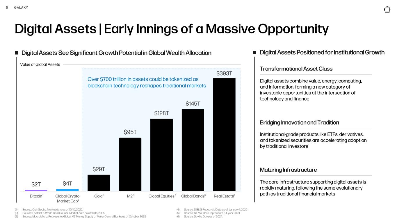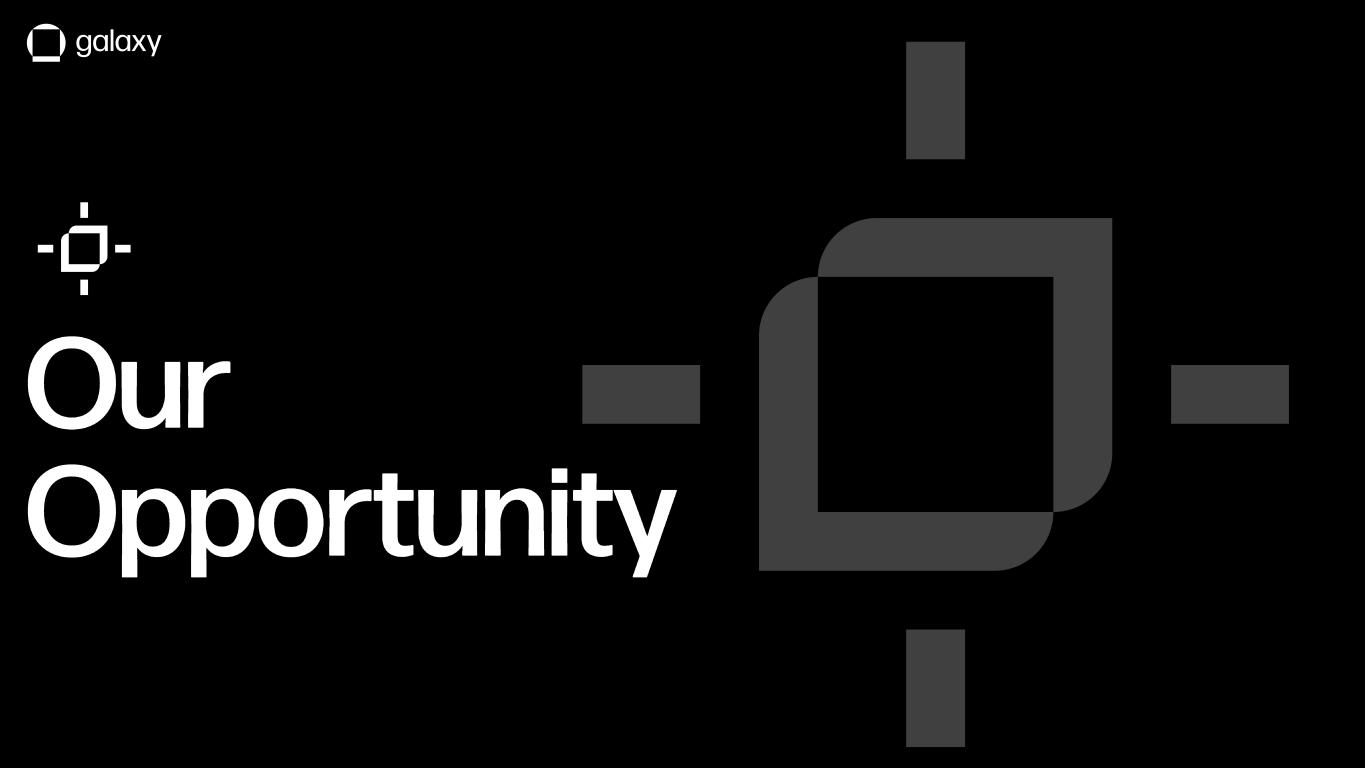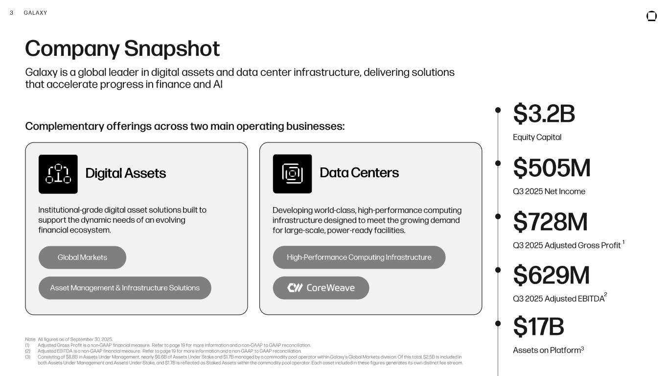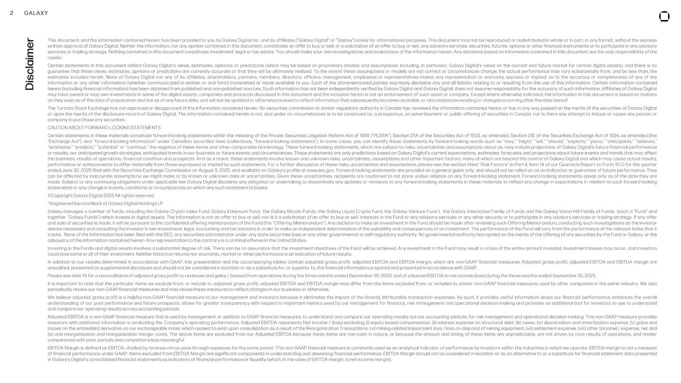 2 GALAXY D is cl ai m er This document, and the information contained herein, has been provided to you by Galaxy Digital Inc . and its affiliates (“Galaxy Digital” or “Galaxy”) solely for informational purposes . This document may not be reproduced or redistributed in whole or in part, in any format, without the express written approval of Galaxy Digital . Neither the information, nor any opinion contained in this document, constitutes an offer to buy or sell, or a solicitation of an offer to buy or sell, any advisory services, securities, futures, options or other financial instruments or to participate in any advisory services or trading strategy . Nothing contained in this document constitutes investment, legal or tax advice . You should make your own investigations and evaluations of the information herein . Any decisions based on information contained in this document are the sole responsibility of the reader . Certain statements in this document reflect Galaxy Digital’s views, estimates, opinions or predictions (which may be based on proprietary models and assumptions, including , in particular, Galaxy Digital’s views on the current and future market for certain digital assets), and there is no guarantee that these views, estimates, opinions or predictions are currently accurate or that they will be ultimately realized . To the extent these assumptions or models are not correct or circumstances change, the actual performance may vary substantially from, and be less than, the estimates included herein . None of Galaxy Digital nor any of its affiliates, shareholders, partners, members, directors, officers, management, employees or representatives makes any representation or warranty, express or implied, as to the accuracy or completeness of any of the information or any other information (whether communicated in written or oral form) transmitted or made available to you. Each of the aforementioned parties expressly disclaims any and all liability relating to or resulting from the use of this information . Certain information contained herein (including financial information) has been obtained from published and non-published sources . Such information has not been independently verified by Galaxy Digital and Galaxy Digital, does not assume responsibility for the accuracy of such information . Affiliates of Galaxy Digital may have owned or may own investments in some of the digital assets, companies and protocols discussed in this document and the inclusion herein is not an endorsement of such asset or company . Except where otherwise indicated, the information in this document is based on matters as they exist as of the date of preparation and not as of any future date, and will not be updated or otherwise revised to reflect information that subsequently becomes available, or circumstances existing or changes occurring after the date hereof . The Toronto Stock Exchange has not approved or disapproved of the information contained herein . No securities commission or similar regulatory authority in Canada has reviewed the information contained herein or has in any way passed on the merits of the securities of Galaxy Digital or upon the merits of the disclosure record of Galaxy Digital . The information contained herein is not, and under no circumstances is to be construed as, a prospectus, an advertisement or public offering of securities in Canada, nor is there any attempt to induce or cause any person or company to purchase any securities . CAUTION ABOUT FORWARD -LOOKING STATEMENTS Certain statements in these materials constitute forward -looking statements within the meaning of the Private Securities Litigation Reform Act of 1995 (“PLSRA”), Section 27A of the Securities Act of 1933, as amended, Section 21E of the Securities Exchange Act of 1934, as amended (the “Exchange Act”), and “forward -looking information” under Canadian securities laws (collectively, “forward -looking statements”) . In some cases, you can identify these statements by forward -looking words such as “may,” “might,” “will,” “should,” “expects,” “plans,” “anticipates,” “believes,” “estimates,” “predicts,” “potential” or “continue,” the negative of these terms and other comparable terminology . These forward -looking statements, which are subject to risks, uncertainties and assumptions about us, may include projections of Galaxy Digital’s future financial performance or results, our anticipated growth strategies, anticipated trends in our business or future events and circumstances . These statements are only predictions based on Galaxy Digital’s current expectations, estimates, forecasts and projections about future events and trends that may affect the business, results of operations, financial condition and prospects . And as a result, these statements involve known and unknown risks, uncertainties, assumptions and other important factors, many of which are beyond the control of Galaxy Digital and which may cause actual results, performance or achievements to differ materially from those expressed or implied by such statements . For a further discussion of these risks, uncertainties and assumptions, please see the section titled “Risk Factors” in Part II, Item 1A of our Quarterly Report on Form 10-Q for the quarter ended June 30 , 2025 filed with the Securities Exchange Commission on August 5, 2025 , and available on Galaxy’s profile at www.sec .gov . Forward -looking statements are provided as a general guide only, and should not be relied on as an indication or guarantee of future performance . They can be affected by inaccurate assumptions we might make or by known or unknown risks or uncertainties . Given these uncertainties, recipients are cautioned to not place undue reliance on any forward -looking statement . Forward -looking statements speak only as of the date they are made . Subject to any continuing obligations und