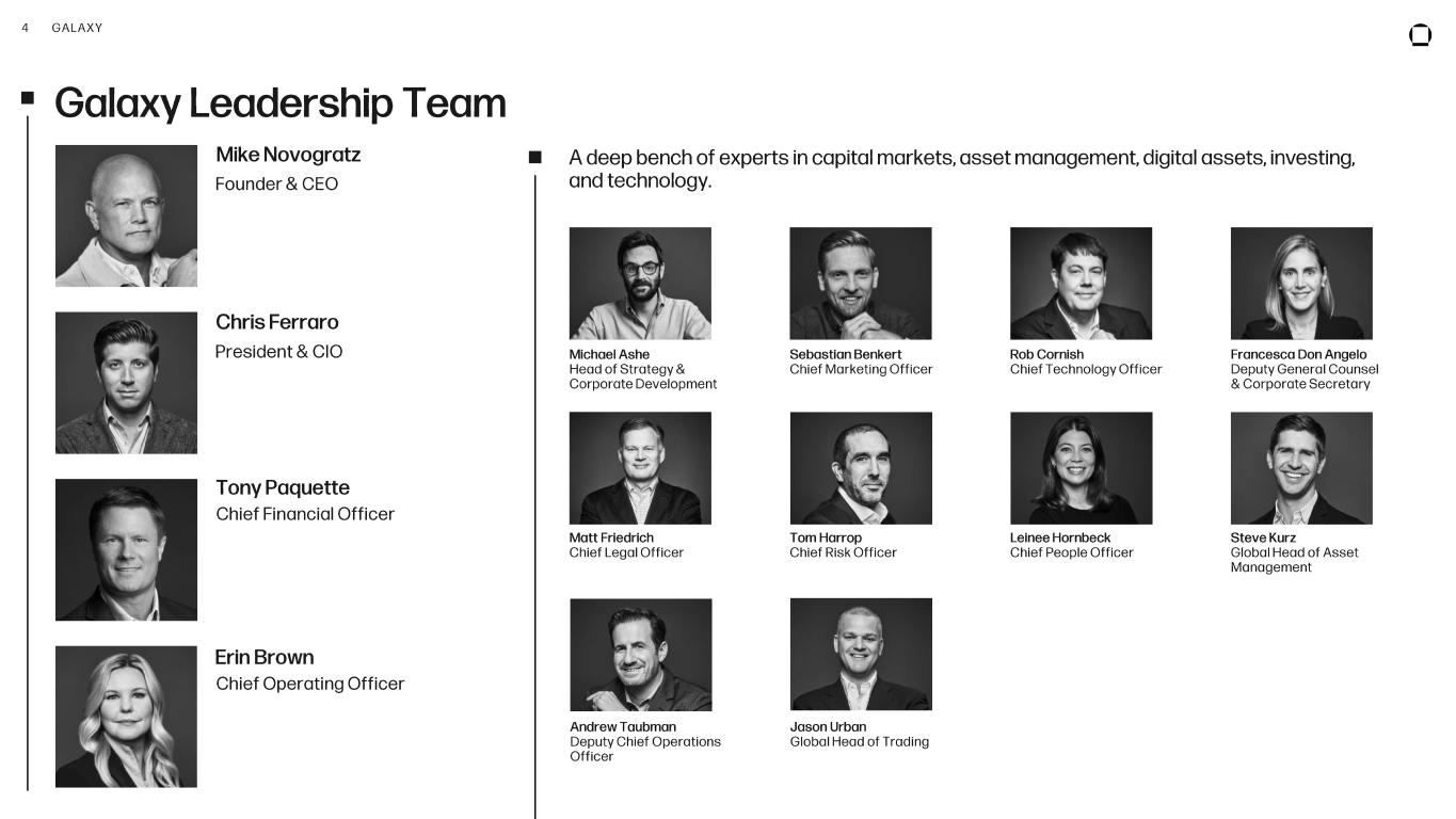 3 GALAXY Equity Capital $3.2B Note: All figures as of September 30, 2025. (1) Adjusted Gross Profit is a non -GAAP financial measure. Refer to page 19 for more information and a non -GAAP to GAAP reconciliat ion. (2) Adjusted EBITDA is a non -GAAP financial measure. Refer to page 19 for more information and a non -GAAP to GAAP reconciliation. (3) Consisting of $8.8B in Assets Under Management, nearly $6.6B of Assets Under Stake and $1.7B managed by a commodity pool oper ator within Galaxy’s Global Markets division. Of this total, $2.5B is included in both Assets Under Management and Assets Under Stake, and $1.7B is reflected as Staked Assets within the commodity pool operat or. Each asset included in these figures generates its own distinct fee stream. Galaxy is a global leader in digital assets and data center infrastructure, delivering solutions that accelerate progress in finance and AI Company Snapshot Q3 2025 Net Income $505M Q3 2025 Adjusted Gross Profit $728M Q3 2025 Adjusted EBITDA $629M Complementary offerings across two main operating businesses: Digital Assets Institutional-grade digital asset solutions built to support the dynamic needs of an evolving financial ecosystem. Global Markets Asset Management & Infrastructure Solutions Data Centers Developing world -class, high -performance computing infrastructure designed to meet the growing demand for large -scale, power -ready facilities. High-Performance Computing Infrastructure Assets on Platform 3 $17B 2 1