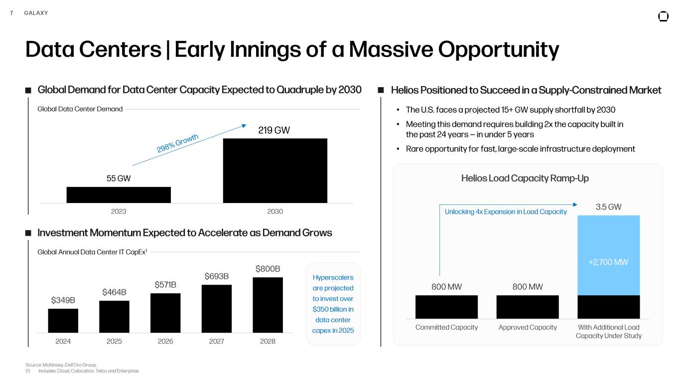 6 GALAXY (1) Source: CoinGecko . Market data as of 10/15/2025. (2) Source: FactSet & World Gold Council. Market data as of 10/15/2025. (3) Source: MacroMicro . Represents Global M2 Money Supply of Major Central Banks as of October 2025. (4) Source: SIBLIS Research, Data as of January 1, 2025 (5) Source: SIFMA. Data represents full year 2024. (6) Source: Savills. Data as of 2024. Digital Assets | Early Innings of a Massive Opportunity Digital Assets See Significant Growth Potential in Global Wealth Allocation Digital Assets Positioned for Institutional Growth Value of Global Assets $2T $4T $29T $95T $128T $145T $393T Bitcoin Global Crypto Market Cap Gold M2 Global Equities Global Bonds Real Estate543 621 1 Over $700 trillion in assets could be tokenized as blockchain technology reshapes traditional markets Transformational Asset Class Digital assets combine value, energy, computing, and information, forming a new category of investable opportunities at the intersection of technology and finance Bridging Innovation and Tradition Institutional-grade products like ETFs, derivatives, and tokenized securities are accelerating adoption by traditional investors Maturing Infrastructure The core infrastructure supporting digital assets is rapidly maturing, following the same evolutionary path as traditional financial markets