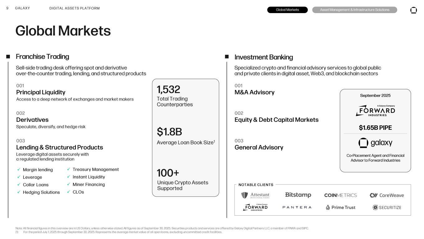 8 GALAXY Digital Assets Serving the digital asset ecosystem end -to-end. Global Markets Asset Management & Infrastructure Solutions