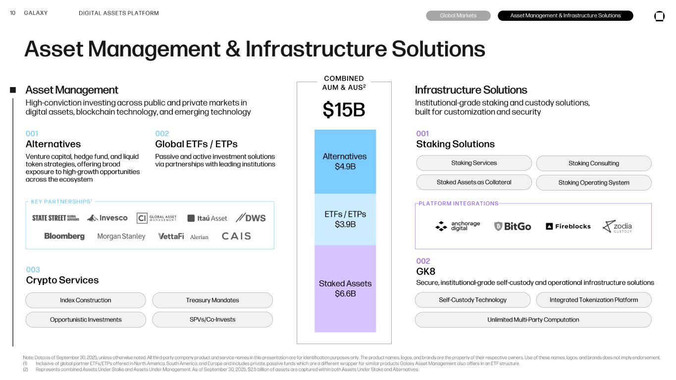 9 GALAXY Global Markets Investment Banking Franchise Trading Sell -side trading desk offering spot and derivative over -the-counter trading, lending, and structured products 001 Principal Liquidity Access to a deep network of exchanges and market makers Specialized crypto and financial advisory services to global public and private clients in digital asset, Web3, and blockchain sectors DIGITAL ASSETS PLATFORM Global Markets Asset Management & Infrastructure Solutions 002 Derivatives Speculate, diversify, and hedge risk ✓ Margin lending ✓ Leverage ✓ Collar Loans ✓ Hedging Solutions ✓ Treasury Management ✓ Instant Liquidity ✓ Miner Financing ✓ CLOs 003 Lending & Structured Products Leverage digital assets securely with a regulated lending institution Total Trading Counterparties 1,532 Average Loan Book Size 1 $1.8B Unique Crypto Assets Supported 100+ 001 M&A Advisory 002 Equity & Debt Capital Markets 003 General Advisory NOTABLE CLIENTS Note: All financial figures in this overview are in US Dollars, unless otherwise stated. All figures as of September 30, 2025 . Securities products and services are offered by Galaxy Digital Partners LLC, a member of FINRA and SIPC. (1) For the period July 1, 2025 through September 30, 2025. Represents the average market value of all open loans, excluding uncommitted credit facilities. September 2025 $1.65B PIPE Co -Placement Agent and Financial Advisor to Forward Industries